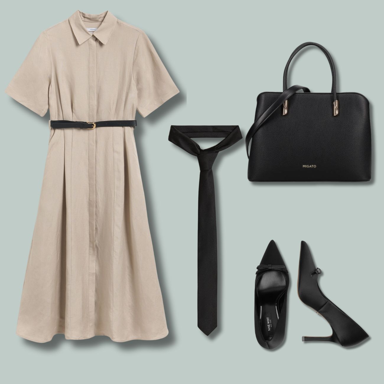 Το φόρεμα έχει κουμπιά μπροστά και μανίκια ελαφρώς σηκωμένα, αποπνέοντας μια casual και άνετη αισθητική, ενώ τα δύο ανοίγματα στο πλάι προσθέτουν κίνηση στο σύνολο. Το outfit συνδυάστηκε με μαύρη λεπτή γραβάτα, που δίνει μια μοντέρνα και αρρενωπή νότα στην εμφάνιση. Οι μαύρες μυτερές γόβες του οίκου Jimmy Choo προσθέτουν κομψότητα και θηλυκότητα, ισορροπώντας το ανδρόγυνο look. Η μαύρη δερμάτινη τσάντα Manu Atelier και τα μεγάλα μαύρα γυαλιά ηλίου ολοκληρώνουν την εικόνα. Τα μαλλιά της είναι πιασμένα πίσω, αναδεικνύοντας τις γωνίες του προσώπου της, αλλά και τα διακριτικά σκουλαρίκια της.