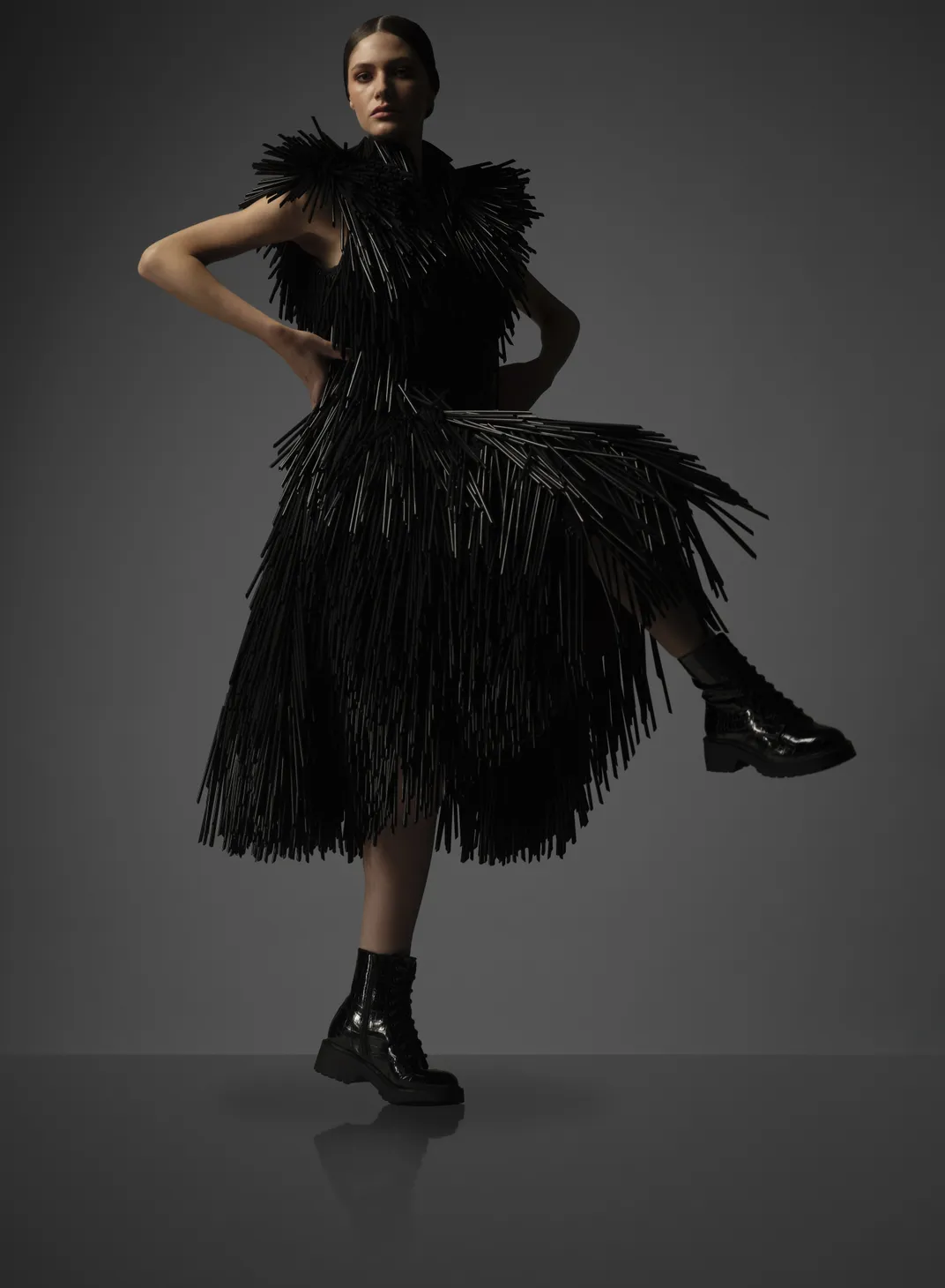 Φόρεμα του Gareth Pugh διακοσμημένο με μαύρα πλαστικά καλαμάκια. Φωτογραφία: David Eustace, National Museum Scotland