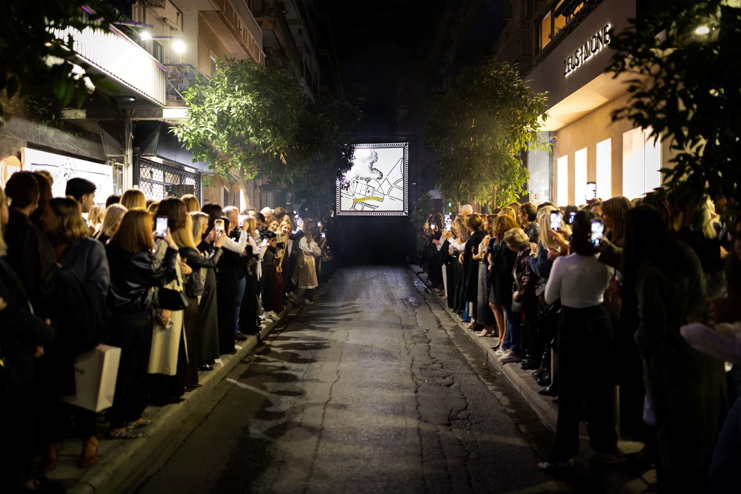 Η παρουσίαση μεταφέρθηκε στον φυσικό χώρο των εγκαινίων, όπου τα στοιχεία του μαντηλιού ζωντάνεψαν. Μουσικά όργανα που απεικονίζονταν πάνω στο μετάξι εμφανίστηκαν πραγματικά, με τους ήχους ενός ακορντεόν να δίνουν το έναυσμα για την έναρξη ενός mini catwalk, όπου παρουσιάστηκαν επιλεγμένα κομμάτια της συλλογής “Chimera” Φθινόπωρο/Χειμώνας 2025, υπό την καλλιτεχνική επιμέλεια του Marios Schwab. Το ακορντεόν διαδέχτηκε μια λατέρνα, πλημμυρίζοντας τον χώρο με το χαρακτηριστικό νοσταλγικό της ήχο και προσδίδοντας στην παρουσίαση μια ζωντανή, πολυαισθητηριακή διάσταση. Το welcome drink και το menu της βραδιάς, επιμελήθηκε το εστιατόριο Moldee.