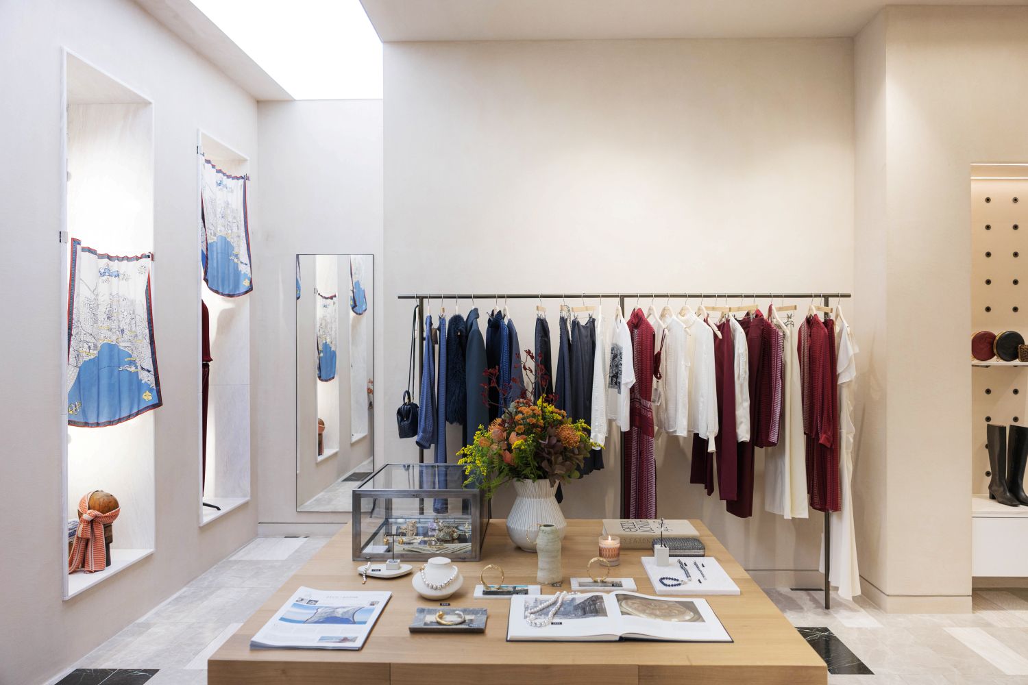 Στο εσωτερικό, οι επισκέπτες μπορούν να ανακαλύψουν τις τρέχουσες συλλογές ready-to-wear, καθώς και μια ευρεία γκάμα αξεσουάρ, κοσμημάτων, δερμάτινων ειδών, μεταξωτών μαντηλιών και homeware αντικειμένων από τη σειρά Philoxenia, εμπνευσμένων από την έννοια της “φιλοξενίας”. Ένας χώρος όπου η μόδα γίνεται τρόπος έκφρασης της ταυτότητας: ήσυχος, αυθεντικός και βαθιά ελληνικός.