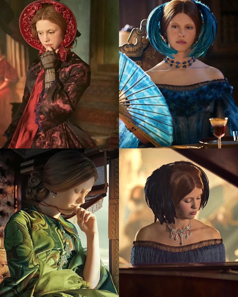 Αλλά και τα υπόλοιπα κοστούμια μιλούν μέσα από τα μοτίβα τους. Οι υφές της Elizabeth εμπνεύστηκαν από εικόνες μικροσκοπικών κυττάρων και ακτίνων Χ, σαν το σώμα να μεταμορφώνεται σε ύφασμα. Στον αντίποδα, το φόρεμα από μαλαχίτη με κρίνες και οργανικά σχέδια συνδέει τη φύση με τη θρησκεία, όπως κάνει και το χαρακτηριστικό κομποσκοίνι της ηρωίδας.