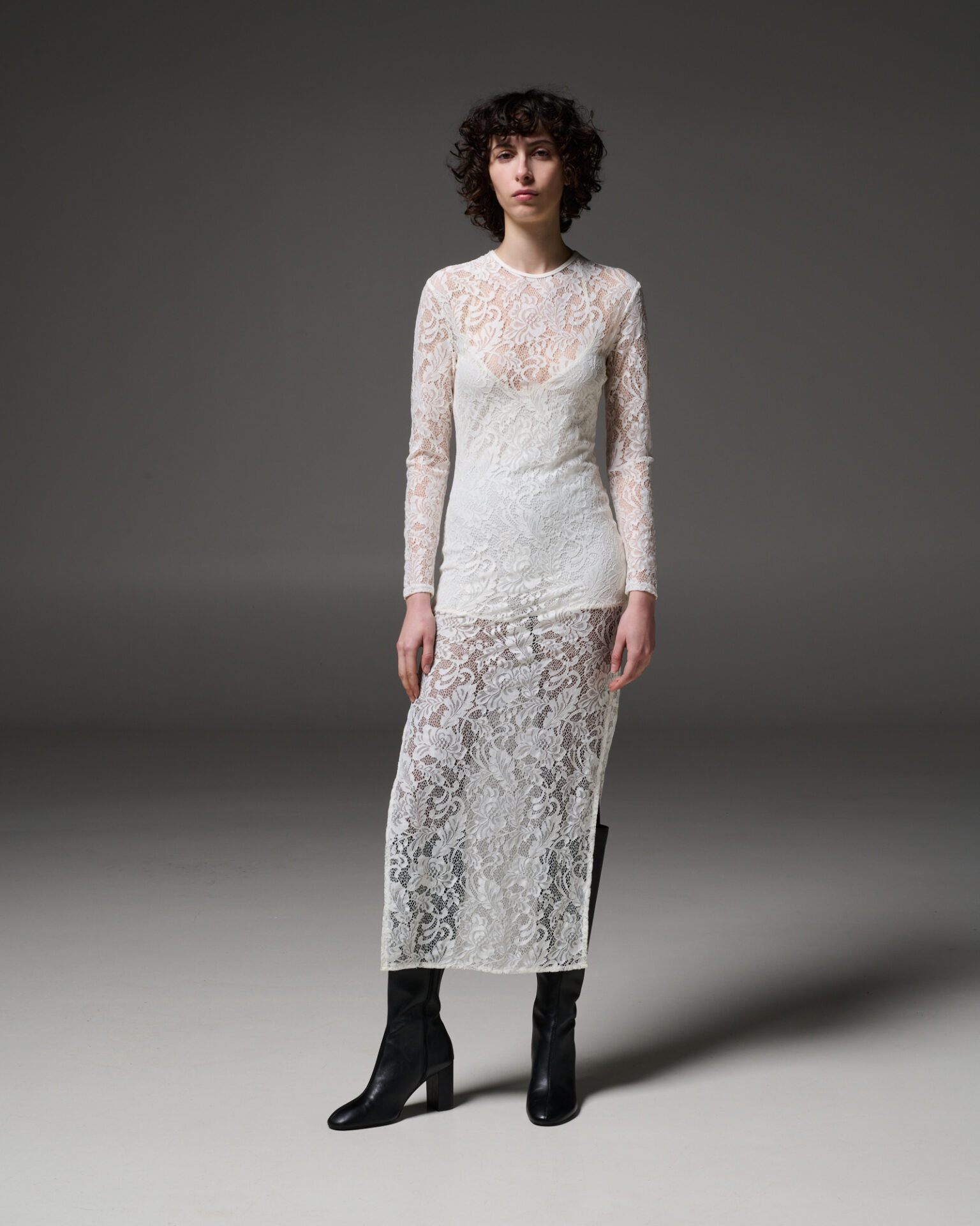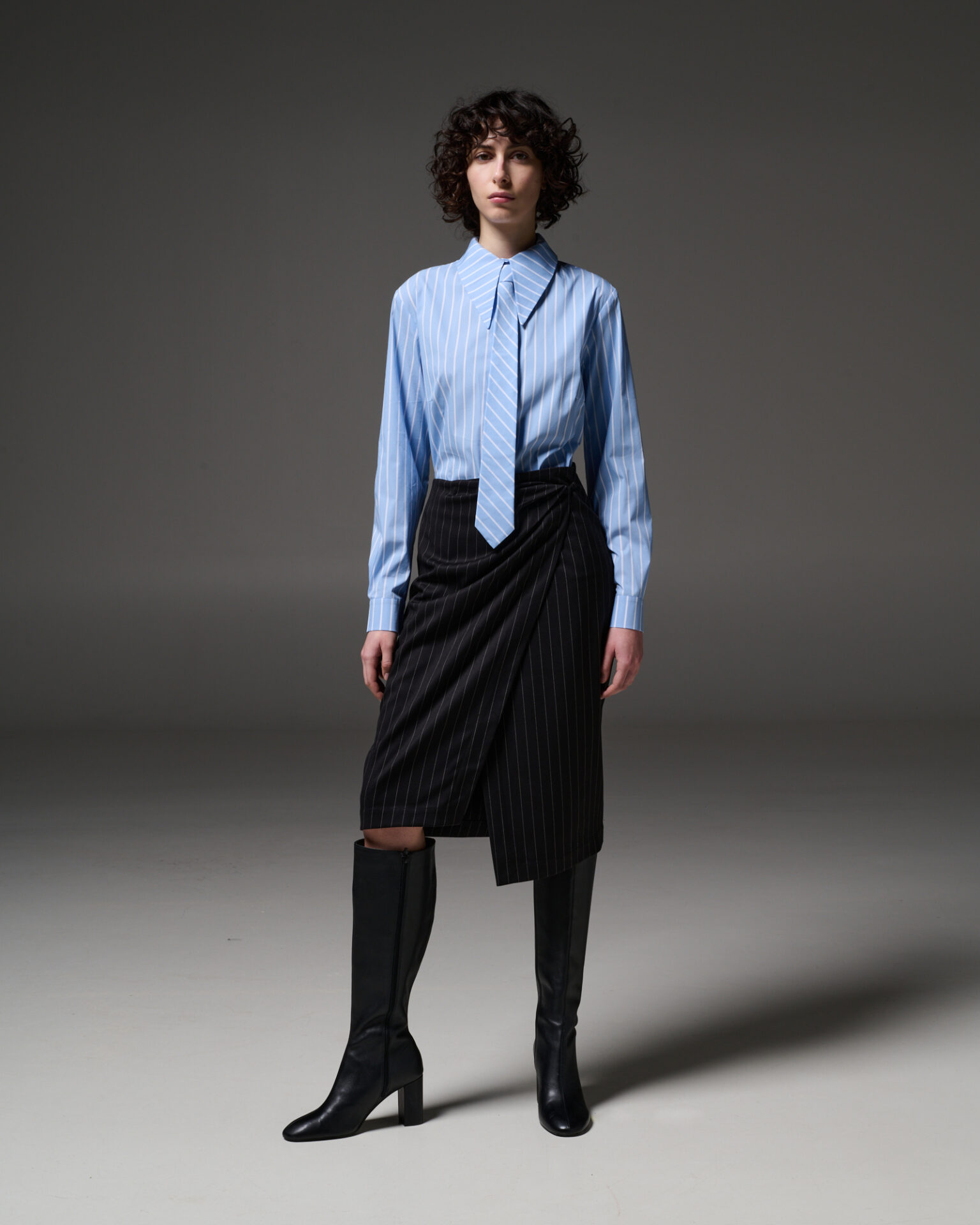Η χρωματική παλέτα — μαύρο, βαθύ πράσινο, μους σοκολά, εκρού — λειτουργεί σαν υπόβαθρο για τη φόρμα, ενισχύοντας την ένταση χωρίς να αφαιρεί την αρμονία.