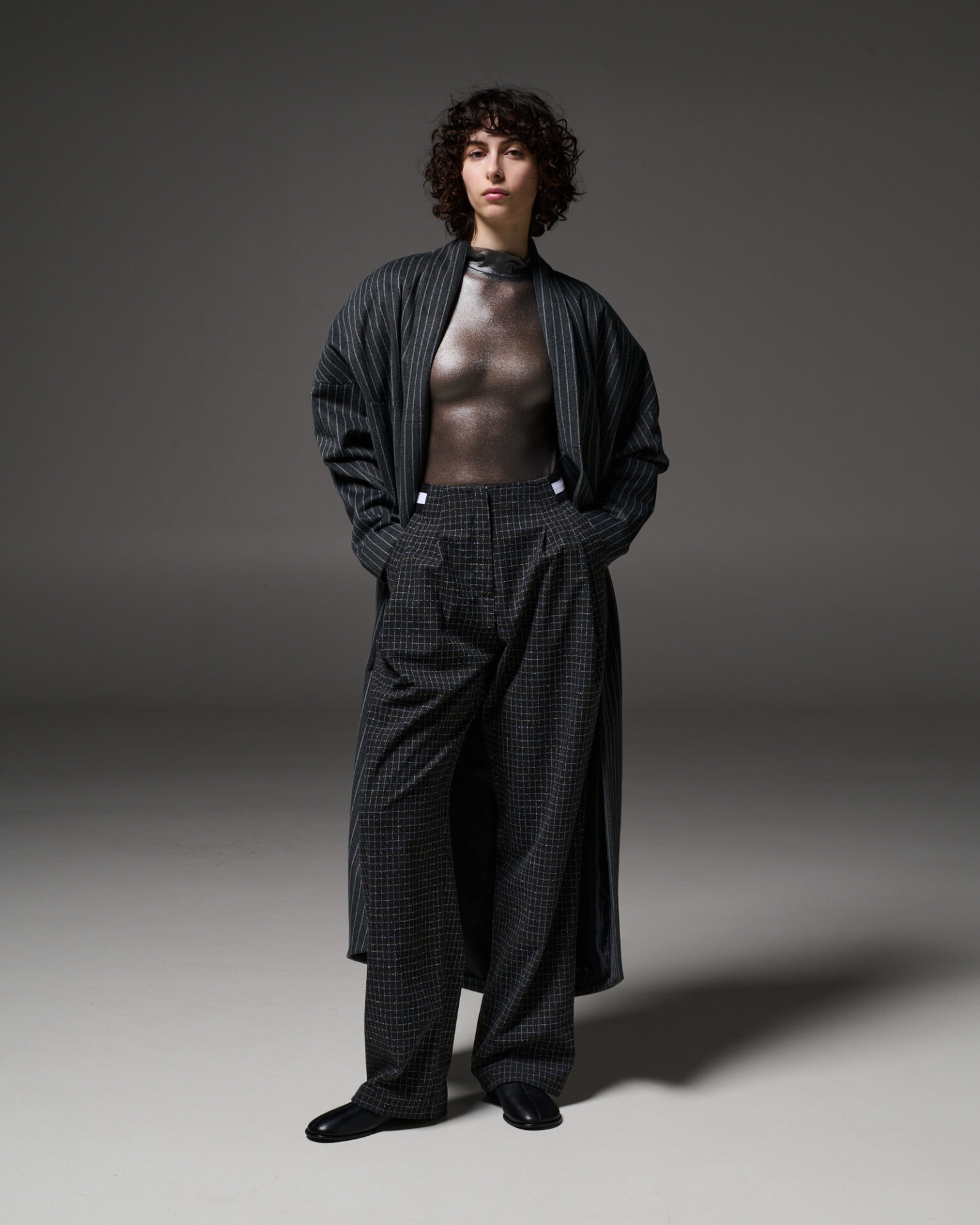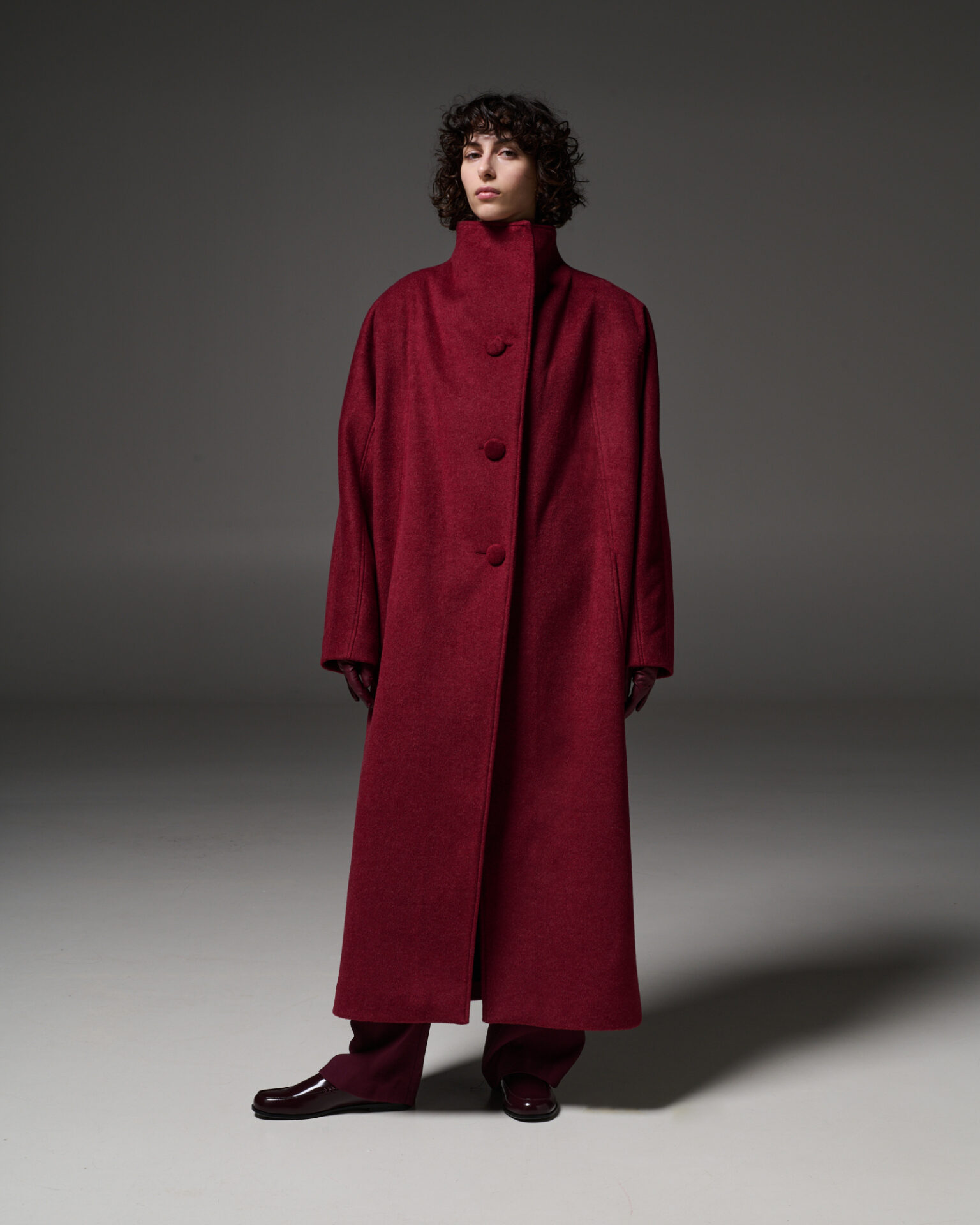 Υπερμεγέθη παλτό, μακριές leather look γκαμπαρντίνες, ζέρσεϊ ντραπέ φορέματα με γλυπτικό μουλάζ και μεταλλικές κρεπ μουσελίνες συνθέτουν μια γλώσσα φόρμας και κίνησης — αρχιτεκτονική, αλλά ταυτόχρονα ζωντανή.