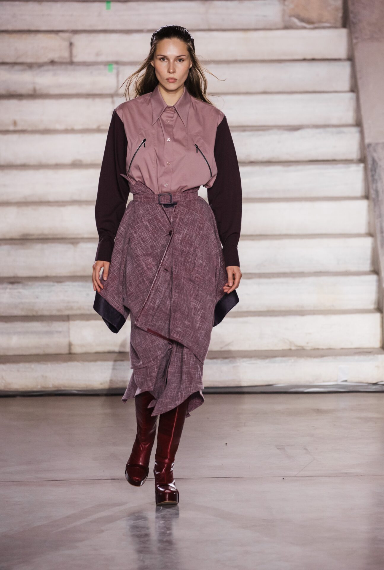 Ο Tassos Mitropoulos παρουσίασε στη συνέχεια τη συλλογή FW’26 The Unbound, που απελευθερώνει τη σιλουέτα από κάθε περιορισμό. Δέρμα, κρόσια και αυστηρό tailoring μεταμορφώνουν το ανδρικό και θηλυκό στοιχείο σε μια ενιαία ενέργεια, δημιουργώντας ρούχα δύναμης, κίνησης και δυναμικής παρουσίασης.