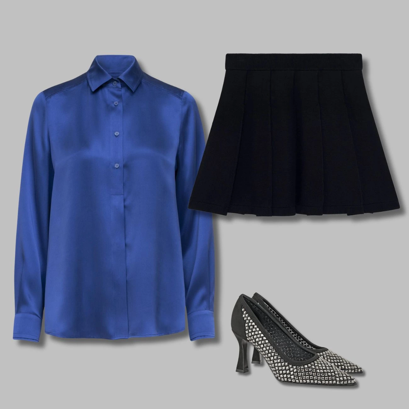 Το look της Μαριέττας Χρουσαλά δεν ταιριάζει μόνο σε ρεβεγιόν. Μπορεί να φορεθεί σε οικογενειακά ή φιλικά dinners, αλλά και για επίσημες βραδινές εξόδους (Θέατρο, cocktail bar, εστιατόριο) όπου θέλετε να δείχνετε κομψή και περιποιημένη χωρίς υπερβολή. Το σατέν πουκάμισο με τη μίνι φούστα και οι διακριτικά λαμπερές γόβες το κάνουν άνετο, θηλυκό και εύκολο να φορεθεί από το απόγευμα μέχρι το βράδυ. Βρήκαμε λοιπόν 3 προσιτά κομμάτια της ελληνικής αγοράς για να υιοθετήσετε κι εσείς το look της παρουσιάστριας.