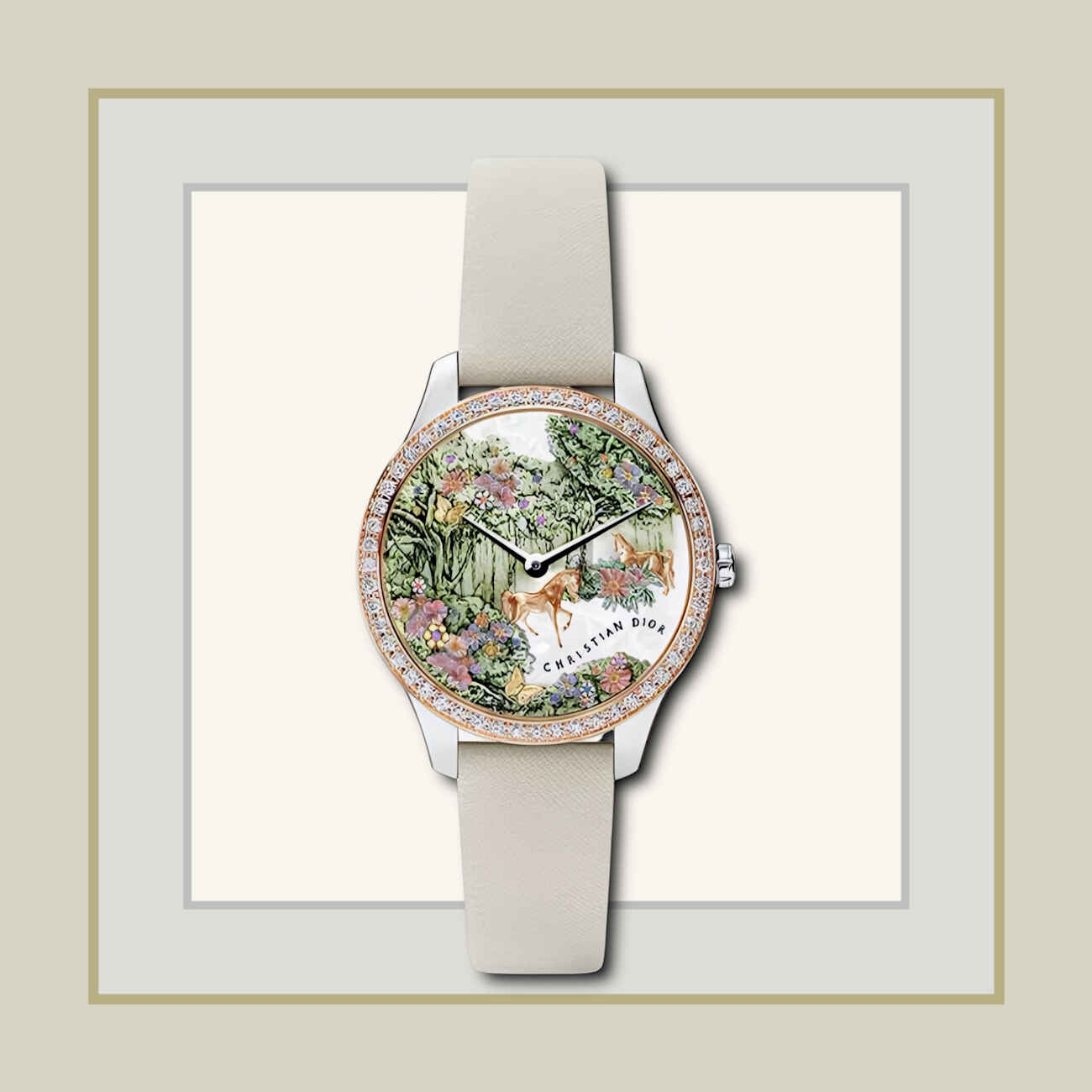 Το καντράν κοσμείται με μια παραλλαγή του μοτίβου Toile de Jouy, όπου το άλογο διασχίζει ένα μαγεμένο δάσος από φίλντισι, χρυσό και πολύχρωμους πολύτιμους λίθους. Η κομψή κάσα των 36 mm πλαισιώνεται από στεφάνη σε 18Κ ροζ χρυσό με διαμάντια, ενώ το λευκό καντράν από φίλντισι είναι διακοσμημένο με ζαφείρια, αμέθυστους και γρανάτες σπεσαρτίτη. Οι δείκτες σε απόχρωση ροζ χρυσού και το μπεζ σατινέ λουράκι ολοκληρώνουν την εκλεπτυσμένη εικόνα. Σε περιορισμένη έκδοση 30 τεμαχίων, το ρολόι περιλαμβάνει αυτόματο μηχανισμό και αποτελεί μια σπάνια συλλεκτική δημιουργία, κατασκευασμένη στην Ελβετία.