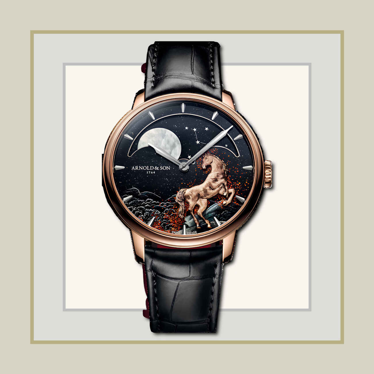 Περιορισμένο σε οκτώ κομμάτια, το χειροχάρακτο άλογο σε 18k κόκκινο χρυσό ξεχωρίζει πάνω στο καντράν από αβεντουρίνη, διακοσμημένο με χρυσή σκόνη ζωγραφισμένη στο χέρι που θυμίζει ίχνη σπινθήρων. Η μεγάλη σεληνιακή ένδειξη από φίλντισι συνοδεύεται από τους αστερισμούς Κασσιόπη και Μεγάλη Άρκτο στον δίσκο της σελήνης.