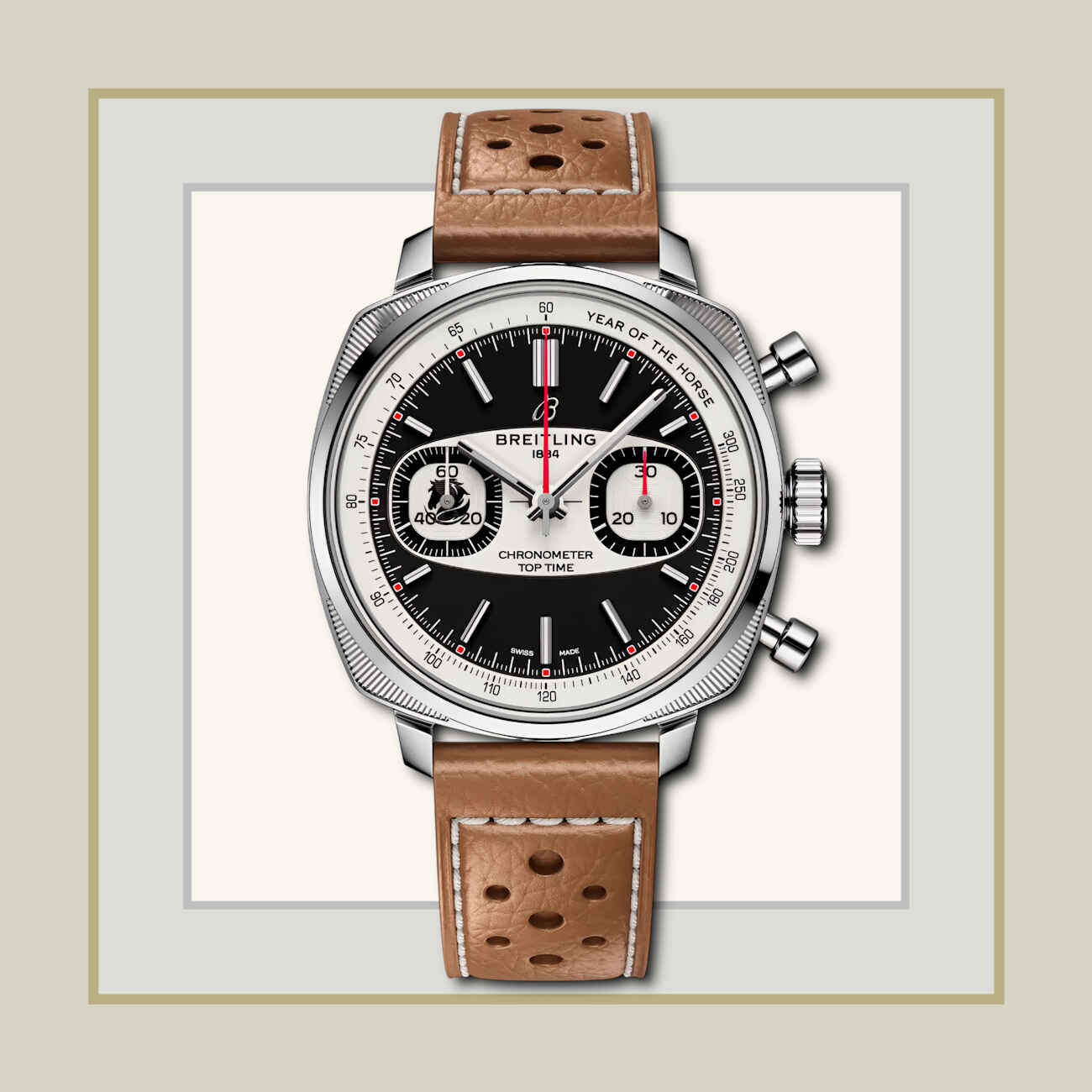 Η Breitling υποδέχεται το Έτος του Αλόγου με αυτή τη limited edition των 288 τεμαχίων σε διάμετρο 38 mm, που συνδυάζει αισθητική εμπνευσμένη από τη δεκαετία του ’60 με διακριτικές ιππικές αναφορές. Ένα στιλιζαρισμένο μοτίβο αλόγου εμφανίζεται στο υποκαντράν στις 9 η ώρα, καθώς και στο καπάκι της κάσας.