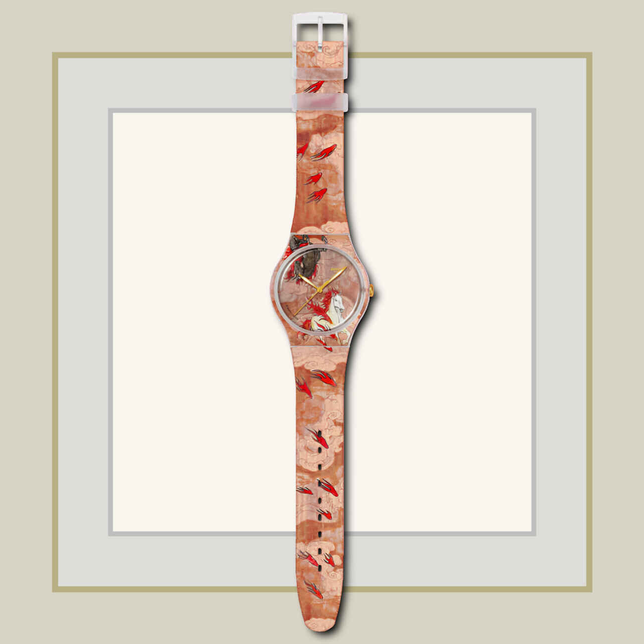 Η πρόταση της Swatch για τη Χρονιά του Αλόγου περιλαμβάνει ένα εντυπωσιακό έργο τέχνης του Yu Wenjie, πρώην καλλιτέχνη-in-residence στο Swatch Art Peace Hotel. Το καντράν απεικονίζει δύο άλογα με φτερά να πετούν μέσα από φλόγες και σύννεφα, με κάθε στοιχείο εμποτισμένο από ευοίωνο συμβολισμό. O ωροδείκτης και ο λεπτοδείκτης λάμπουν στο σκοτάδι, ενώ ενώ το ρολόι ολοκληρώνεται με το διαφανές ματ θηλάκι και κούμπωμα.