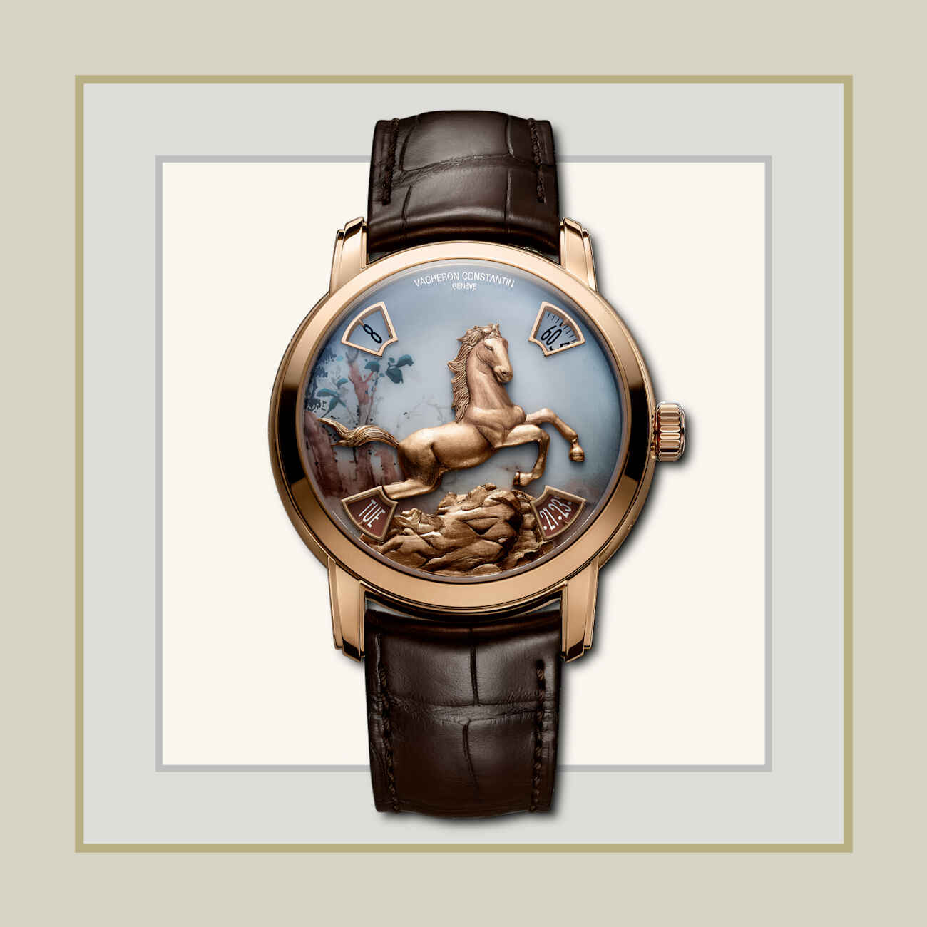 Το άλογο, εμπνευσμένο από τη δυναστεία Tang, στο καντράν δημιουργείται μέσα από συνδυασμό carbon marquetry τοποθετημένης στο χέρι και απλικέ από επιχρυσωμένο μπρούτζο 3N. Οι τρισδιάστατες χρυσές γραμμές είναι σχολαστικά σμιλεμένες ώστε να θυμίζουν αρχαία κινεζικά κεντήματα σε τελετουργικές ενδυμασίες.