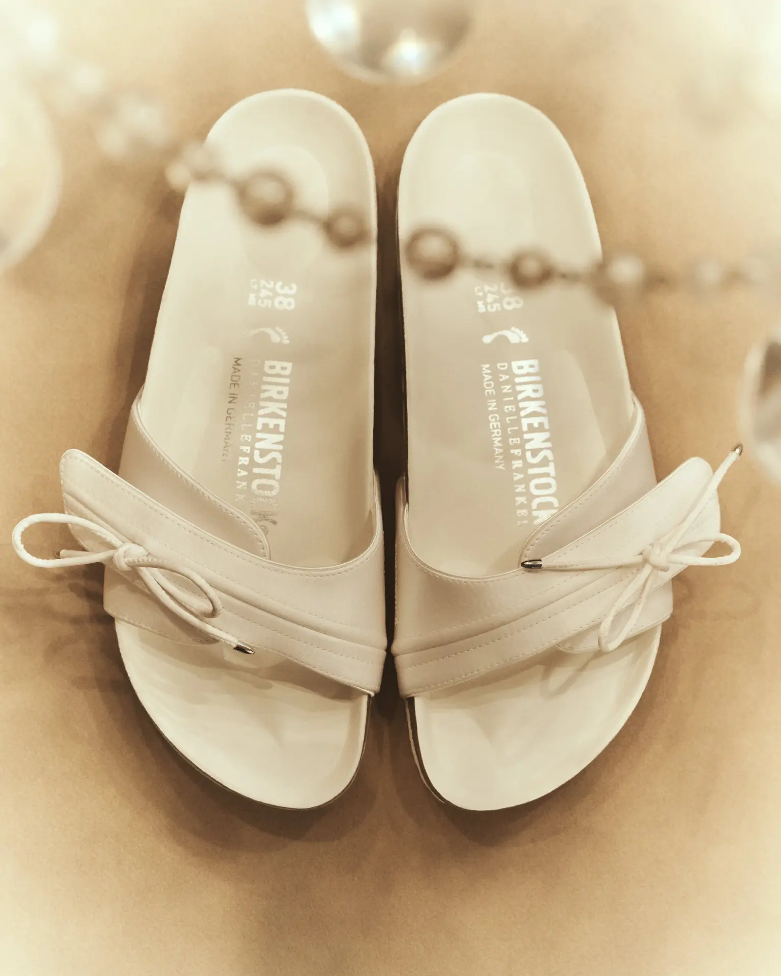 Στη συλλογή, το πρώτο σανδάλι της Birkenstock, το Madrid (1963), επανασχεδιάζεται με λεπτά δεσίματα που τονίζουν τη μίνιμαλ γραμμή του. Το Arizona παρουσιάζεται σε λευκό σατέν, διακοσμημένο με ρυθμικά τοποθετημένα μαργαριτάρια, αλλά και σε μια πιο λιτή, unisex μαύρη εκδοχή. Το Tulum ξεχωρίζει με διακριτικό μαργαριταρένιο τελείωμα στα χιαστί λουράκια και slingback λουρί στη φτέρνα.