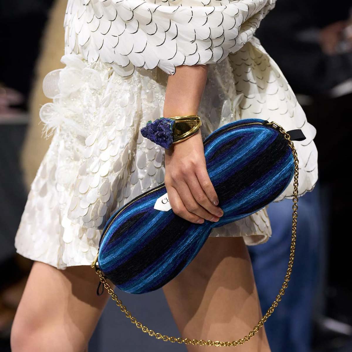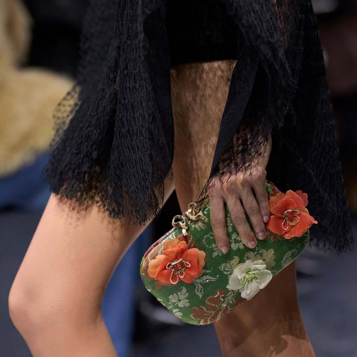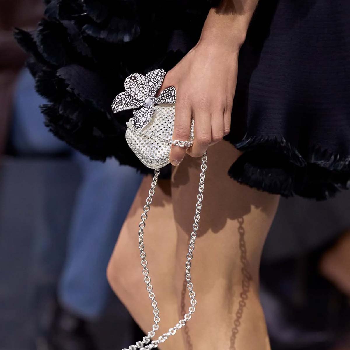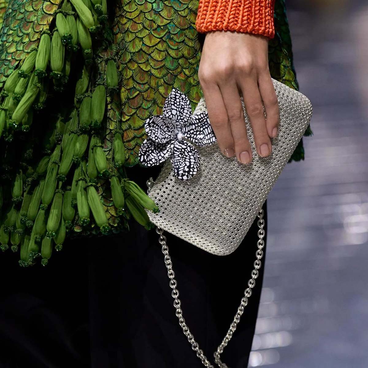 Με το σκηνικό του show να παραπέμπει σε κρεμαστό κήπο που κατακλυζόταν από κυκλάμινα, πολλές τσάντες κινήθηκαν γύρω από το θέμα της άνοιξης και κατ’ επέκταση της φύσης. Clutches και minaudière bags διακοσμημένα με πολύχρωμα λουλούδια, κουμπώματα από Swarovski σε σχήμα λουλουδιών ήταν ανάλαφρα και ιδιαίτερα lady-like. Σφαιρικά chain bags σπό μικροσκοπικά λουλούδια είχαν μια αέρινη κίνηση. Χαριτωμένες πασχαλίτσες και σκαθάρια απέπνεαν κομψότητα με ένα αναπάντεχα φρέσκο ύφος. Ολόλευκα τσαντάκια με πούλιες σε σχήμα λουλουδιών είχαν μια πρωτογενή καθαρότητα που καθήλωνε με την απλότητα της. Κάποια κομμάτια ήταν τόσο πολυτελή και λεπτομερή που αναπόφευκτα τα παρομοιάσαμε με μικρά έργα τέχνης, όσο κι αν αυτό ακούγεται κλισέ. Γιατί όντως ήταν.