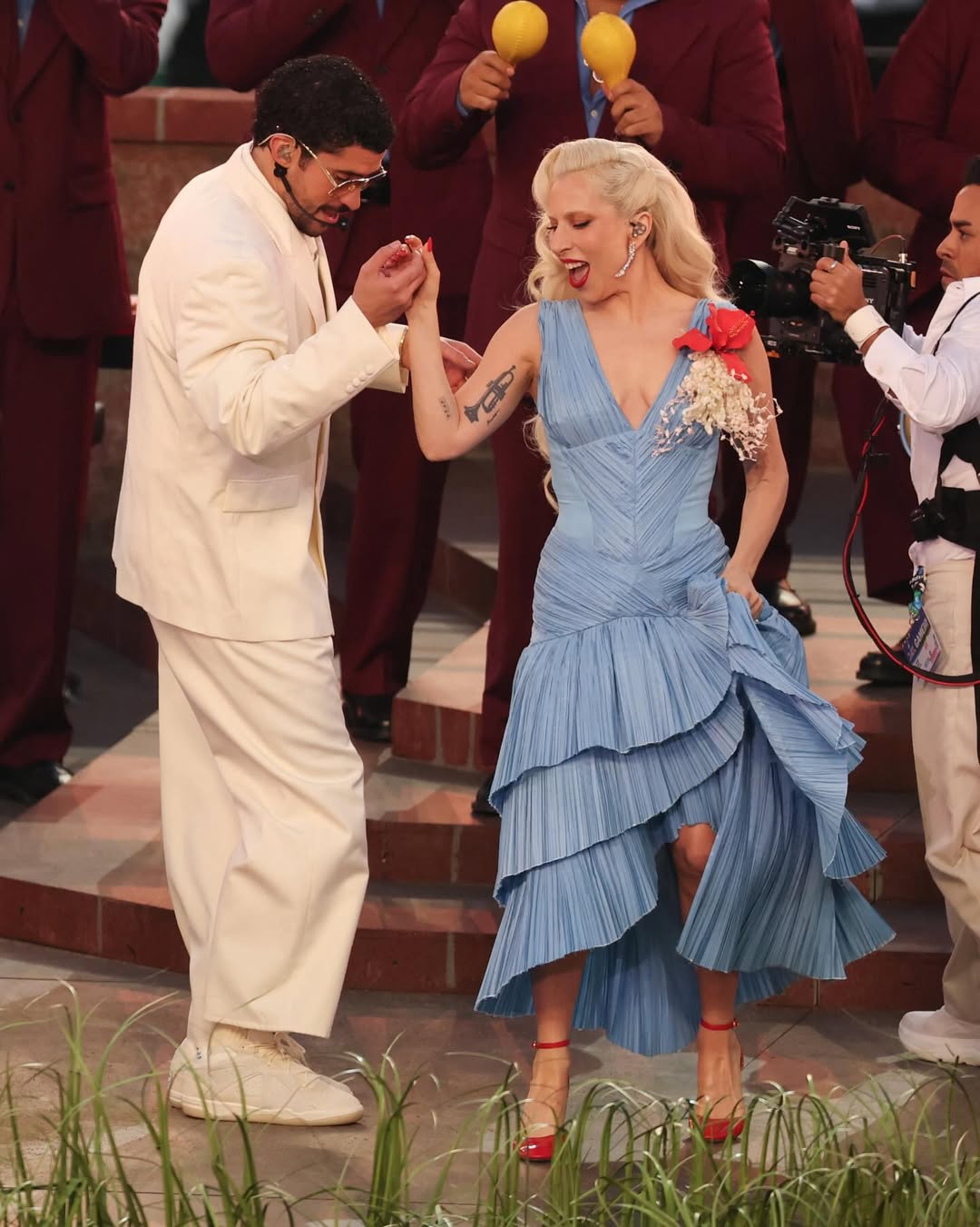 Η Lady Gaga επέστρεψε απρόσμενα στη σκηνή του Super Bowl, κάνοντας μια εντυπωσιακή cameo εμφάνιση στο halftime show του Bad Bunny. Φόρεσε ένα baby blue φόρεμα σε στιλ φλαμένκο, με κορσέ V-λαιμόκοψη, σούρες στο μπούστο και χαμηλή μέση. Η φούστα αποτελούνταν από στενές, πλισέ σειρές που δημιουργούσαν ένα ασύμμετρο, ψηλό-χαμηλό βολάν, χαρίζοντας έντονη κίνηση καθώς χόρευε στα σκαλιά του σταδίου, πλαισιωμένη από τη χάλκινη μπάντα του Bad Bunny.