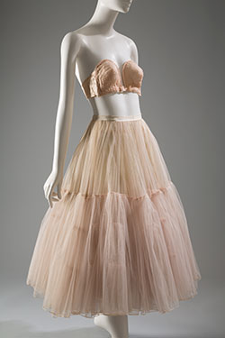 Σουτιέν Poirette με ενισχυμένες μπανέλες, νάιλον δαντέλα, ελαστικό σατέν, 1949, Η.Π.Α., δωρεά από την Bestform Inc., Φουστάνι Christian Dior, δίχτυ νάιλον, δίχτυ με τρίχα αλόγου, μεταξωτό ταφτά, 1951, Γαλλία, δωρεά από τη Despina Messinesi