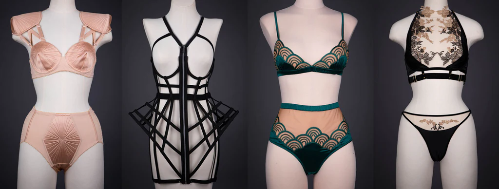 Σύγχρονες μάρκες εσωρούχων, από αριστερά προς τα δεξιά: 2010 Jean Paul Gaultier για La Perla, 2013 Chromat, 2017 Pillowbook, 2022 Hervé By Céline Marie. Photo credit: The Underpinnings Museum και της Tigz Rice.