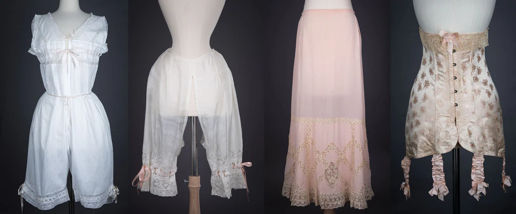 Εσώρουχα του 20ού αιώνα, από αριστερά προς τα δεξιά: Βαμβακερά “combinations” περίπου 1900, μεταξωτά habotai διαχωρισμένα παντελόνια περίπου 1910, μεταξωτό georgette φουστάνι περίπου 1910, κορσές από μετάξι της μάρκας Lafayette περίπου 1910. Photo: The Underpinnings Museum, Tigz Rice.