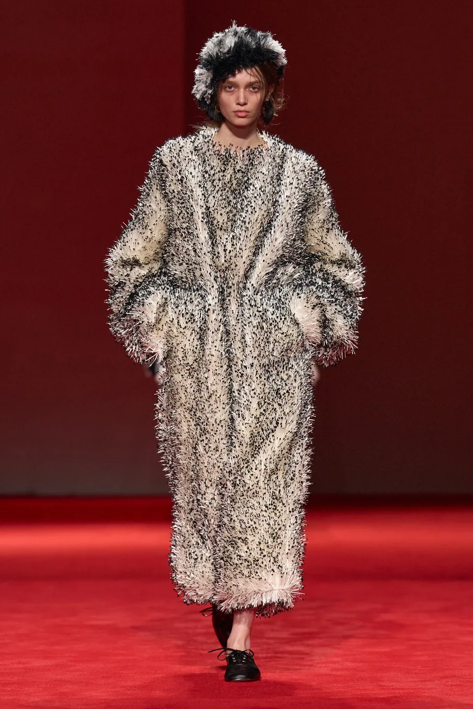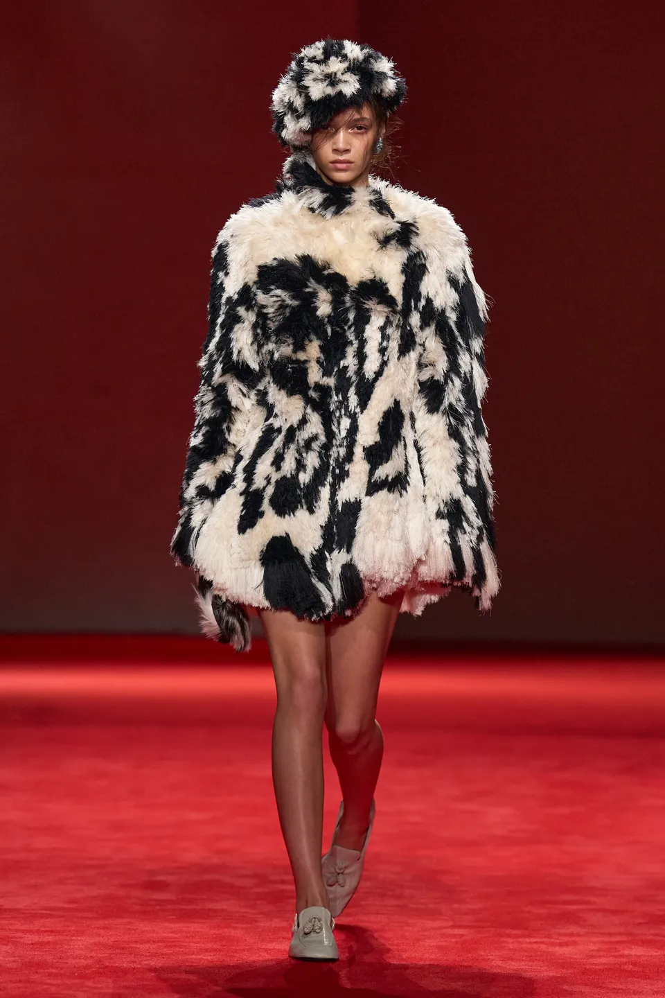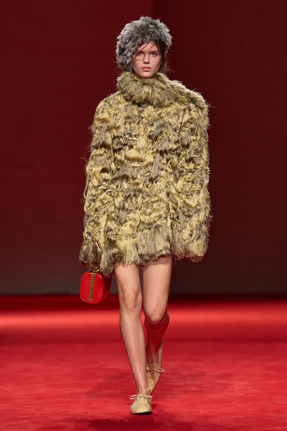 Στην πασαρέλα, στρωμένη με πλούσιο κόκκινο χαλί, κυριάρχησαν καμπαρντίνες που τόνιζαν τη μέση, croc δερμάτινα peacoats, oversized μάλλινες εκδοχές, αλλά και πιο απτικές προσεγγίσεις σε curly shearling και fuzzy υφές που πρόσφεραν όχι μόνο στιλ αλλά και μια αίσθηση προστασίας.