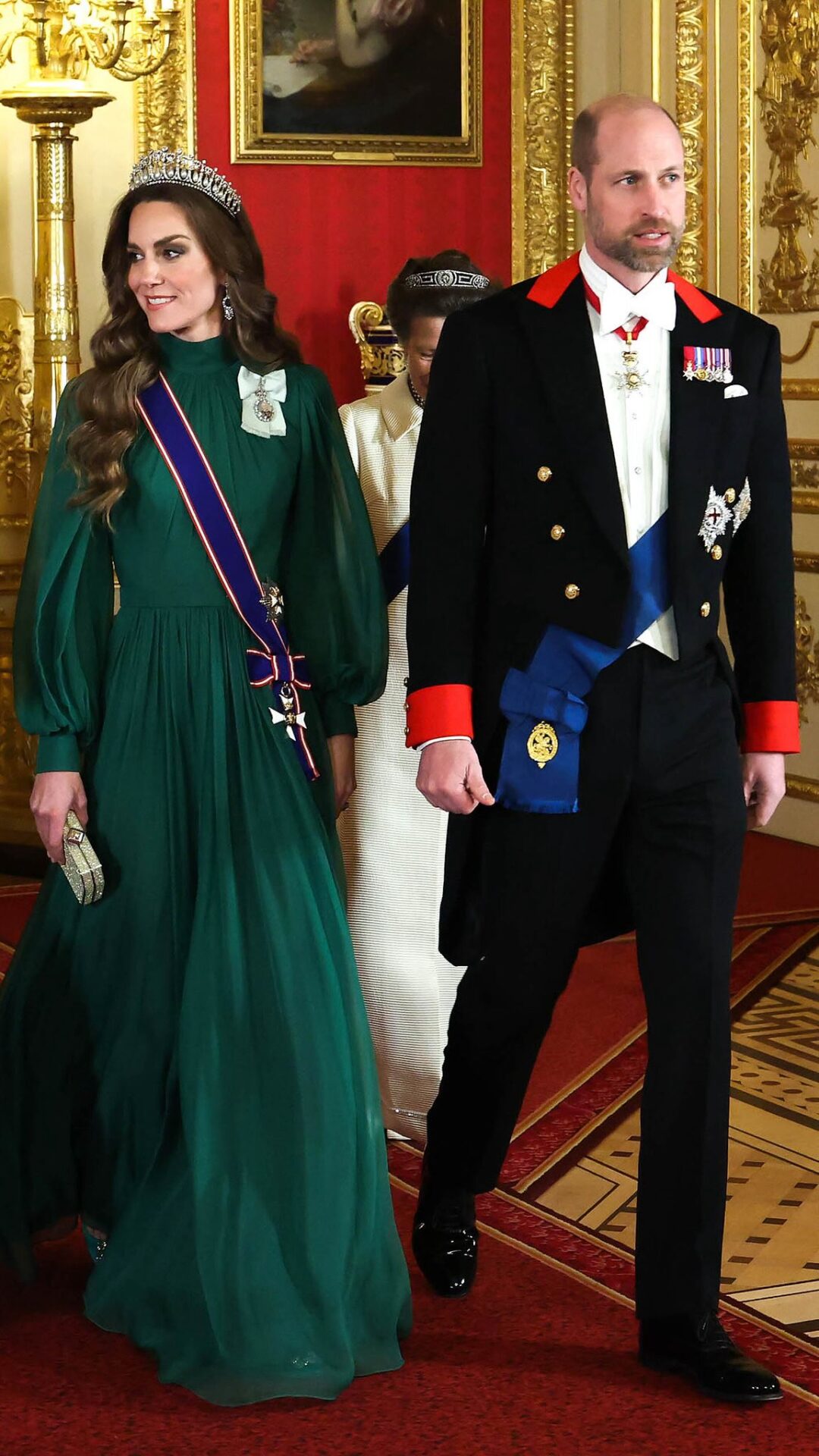 Το βράδυ, στο επίσημο δείπνο στο Κάστρο του Windsor, η Kate Middleton άλλαξε εντελώς ύφος, επιλέγοντας μια εντυπωσιακή σμαραγδί τουαλέτα του οίκου Andrew GN, πιθανή αναφορά στα χρώματα της νιγηριανής σημαίας. Το look ολοκληρώθηκε με σατέν γόβες Manolo Blahnik και clutch της Jenny Packham, ενώ στο επίκεντρο βρέθηκαν τα κοσμήματα.