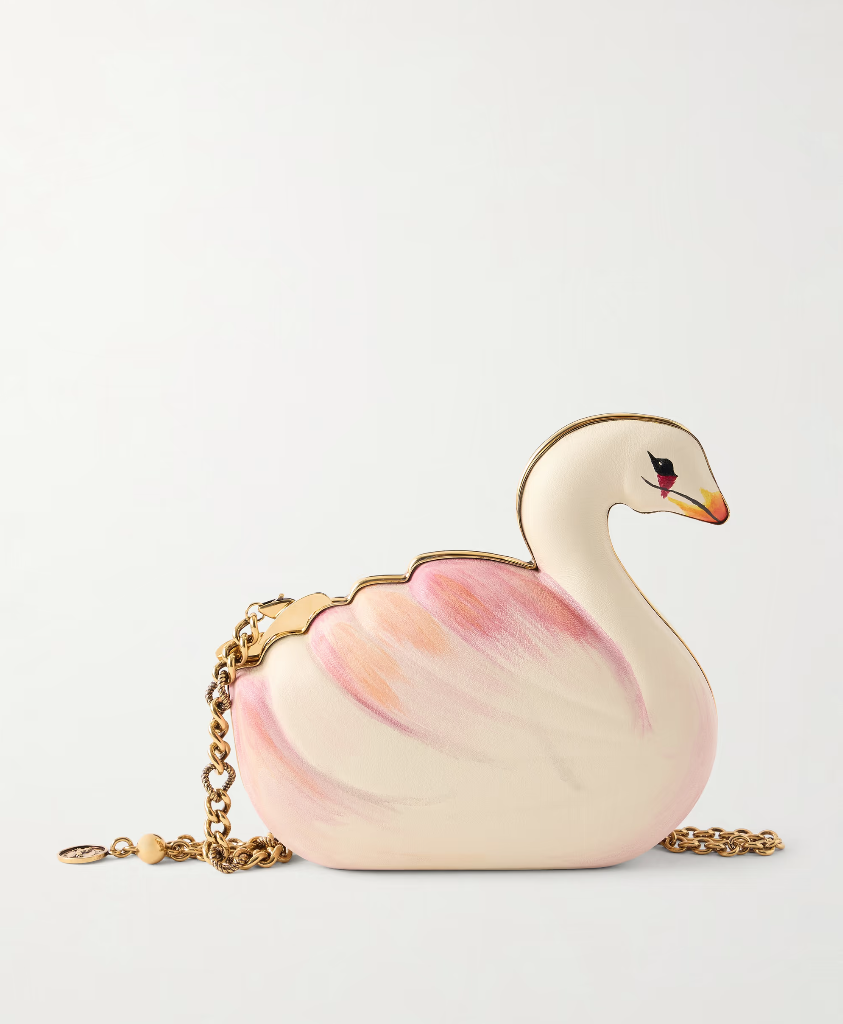Στην πασαρέλα ή στην οθόνη, ο κύκνος εμφανίζεται με πολλαπλές μορφές. Από τις ρευστές γραμμές ενός φορέματος μέχρι τη δομή ενός αξεσουάρ, η σιλουέτα του μεταφράζεται σε design που ισορροπεί ανάμεσα στο ρομαντικό και το σουρεαλιστικό. Στην πρόσφατη συλλογή του ιστορικού οίκου Chloé, μια τσάντα σε σχήμα κύκνου με την ονομασία «Tropicus», μεταμορφώνει το δέρμα σε ποίηση. Ένα χειροποίητο αξεσουάρ, με εφέ ακουαρέλας και λεπτομέρειες σε χρυσό, γίνεται αντικείμενο επιθυμίας αλλά και μικρό γλυπτό. Ένα αντικείμενο που δεν κρατάς απλώς αλλά αφηγείσαι ιστορίες, ακόμη κι αν σχεδιάστηκε για να χωράει μόλις τα απαραίτητα.