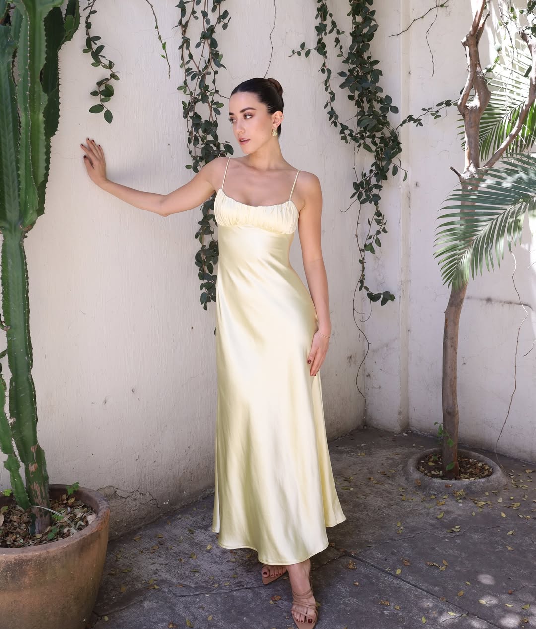 Για τις βραδινές σας εμφανίσεις, ένα μεταξωτό φόρεμα σε butter yellow μπορεί να αναδείξει τη θηλυτικότητα και τη διακριτική κομψότητα του χρώματος, ειδικά όταν συνδυαστεί με χρυσά κοσμήματα που προσθέτουν τη σωστή δόση λάμψης.