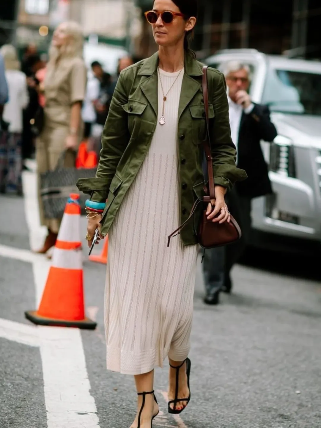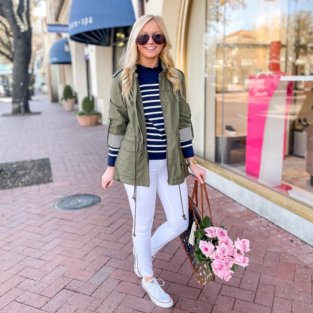 Ο πιο εύκολος (και πάντα σωστός) συνδυασμός περιλαμβάνει χακί jacket, relaxed jeans και λευκό t-shirt ή tank top ή μαρινιέρα. Ένα look που δείχνει ανεπιτήδευτο αλλά πάντα προσεγμένο, ιδανικό για καφέ, βόλτα ή ταξίδι.