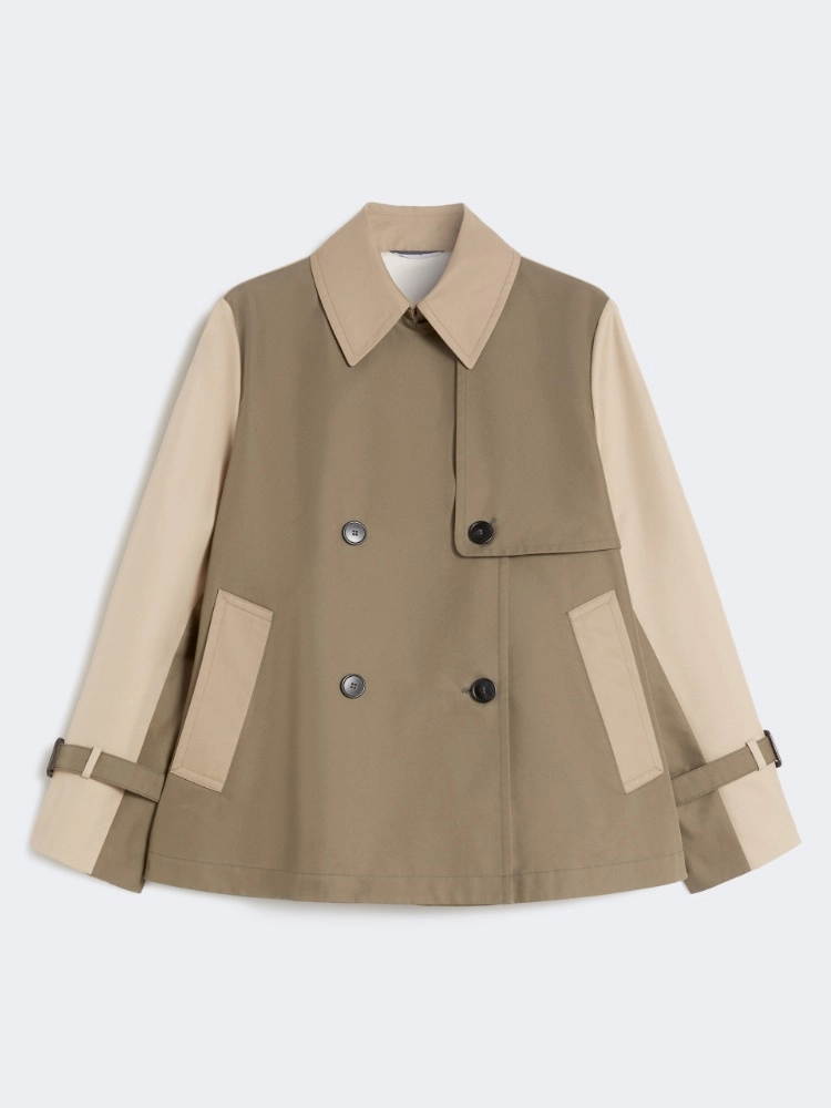 Η διχρωμία σε αυτή τη cropped γκαμπαρντίνα λειτουργεί εξαιρετικά ως βασικό στοιχείο design, προσδίδοντας σύγχρονη φρεσκάδα και οπτικό ενδιαφέρον στο κλασικό κομμάτι. Το μήκος προσφέρει ελευθερία κινήσεων και αναδεικνύει τη μέση, ενώ ο συνδυασμός των δύο αποχρώσεων (η πιο σκούρα στο μπροστινό μέρος και η ανοιχτόχρωμη στα μανίκια και τις τσέπες) αδυνατίζει τη σιλουέτα, δημιουργώντας μια κομψή και μοντέρνα εμφάνιση. Το διπλόμπουκο κλείσιμο εξασφαλίζει αποτελεσματική προστασία από τον άνεμο και τη βροχή και οι ρυθμιζόμενοι ιμάντες στα μανίκια δίνουν τη δυνατότητα προσαρμογής για μεγαλύτερη άνεση, ενώ οι διακριτικές πλευρικές τσέπες εξασφαλίζουν πρακτικότητα.