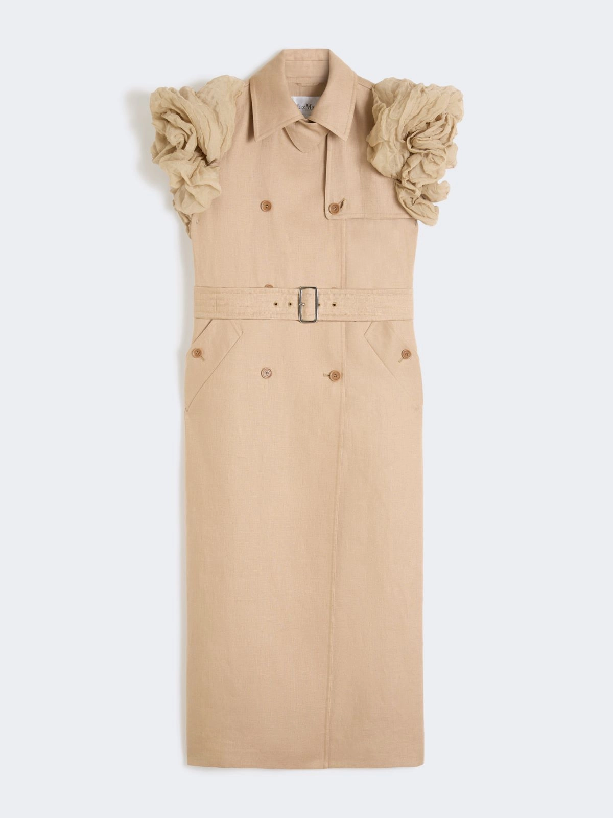 Αν και η συγκεκριμένη γκαμπαρντίνα είναι μακριά, η αμάνικη σχεδίασή της προσφέρει μεγαλύτερη ελευθερία κινήσεων και επιτρέπει να φορεθεί πάνω από διαφορετικά ρούχα χωρίς να περιορίζει το layering. Επιπλέον, οι λεπτομέρειες με βαμβακερή οργάντζα, lurex και μεταξωτά βολάν στους ώμους αναδεικνύουν τα χέρια και προσθέτουν μια θηλυκή, ανάλαφρη αισθητική στο σύνολο.