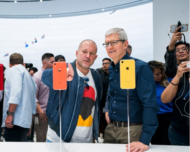 Ο Joni Ive δείχνει στον CEO της Apple Tim Cook, ένα μοντέλο iPhone.
