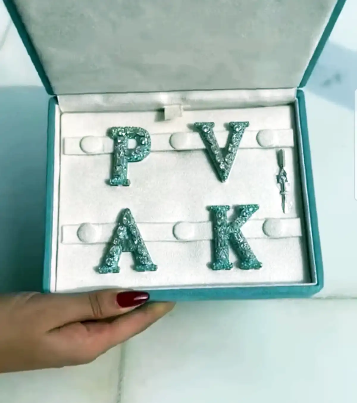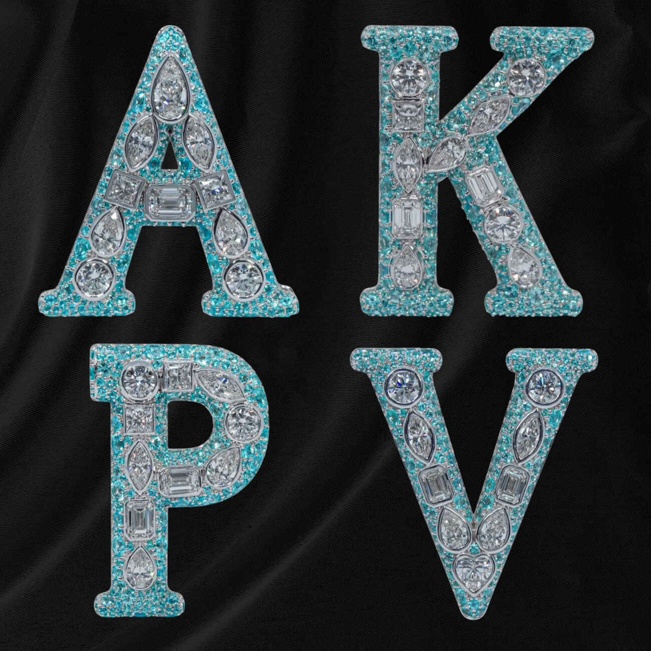 Τα charms “A, K, P, V” είναι διακοσμημένα με διαμάντια υψηλής ποιότητας (και με διαστάσεις σοβαρού μονόπετρου) μαζί με την πιο καυτή πέτρα της σεζόν, την Paraiba, μια πέτρα διάσημη για τις νέον γαλάζιες ανταύγειες της. Λέγεται ότι η πέτρα είναι τόσο σπάνια που μόνο μια Paraiba εξορύσσεται ανάμεσα σε κάθε 10.000 διαμάντια.