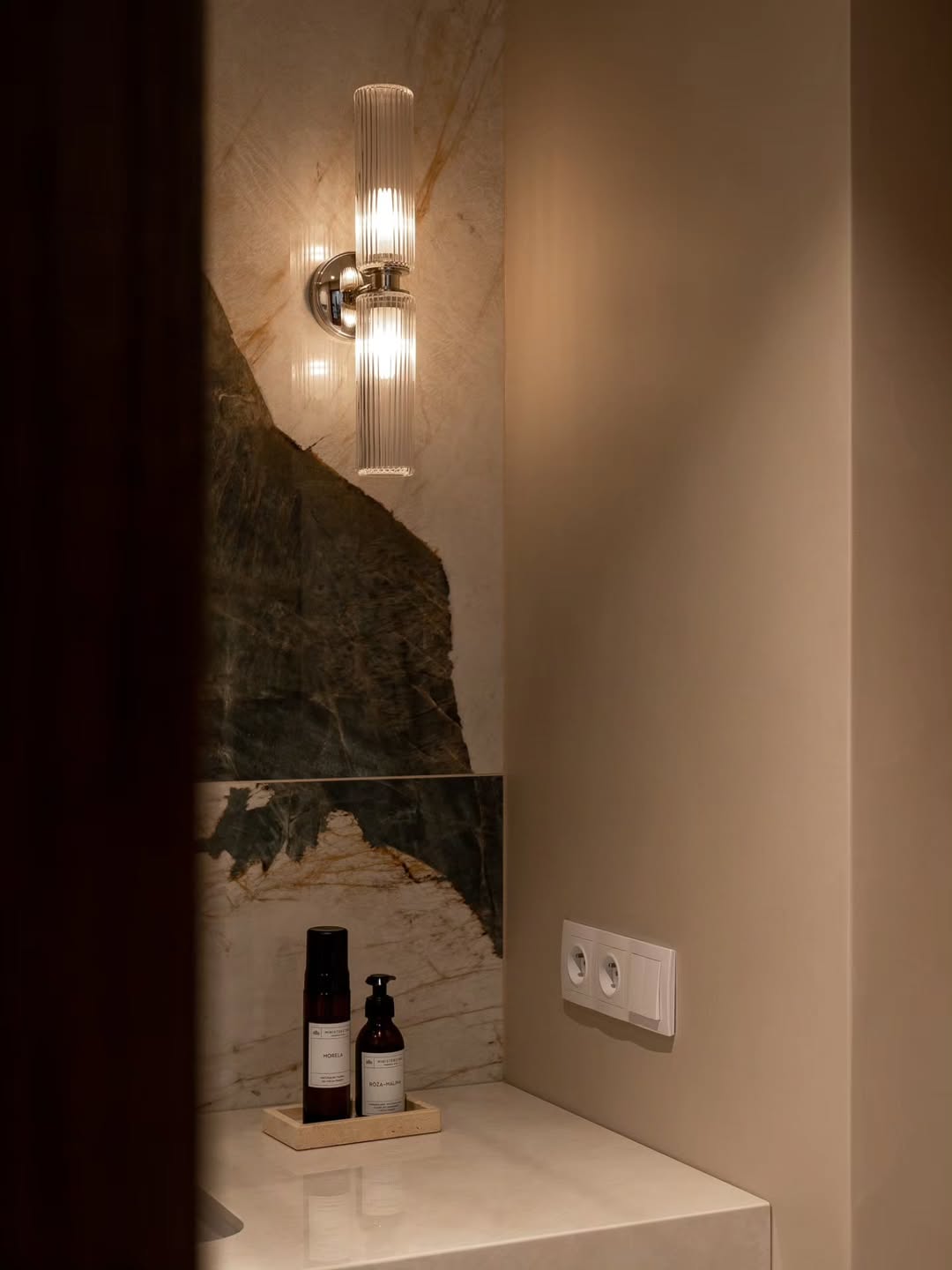 Το μπάνιο αποτελεί ξεχωριστό κεφάλαιο. Εδώ κυριαρχεί το παιχνίδι των φυσικών υλικών: πράσινα πλακάκια, μαρμάρινο μωσαϊκό και ξύλινες λεπτομέρειες συνυπάρχουν σε μια σύνθεση κομψή και ταυτόχρονα ζεστή. Το πράσινο φέρνει μια αίσθηση φρεσκάδας και ανανέωσης, ενώ το μάρμαρο προσθέτει μια διαχρονική αίσθηση πολυτέλειας. Το ξύλο, τέλος, εξισορροπεί τη σύνθεση, προσφέροντας την οικειότητα που χρειάζεται ένα ιδιωτικό δωμάτιο χαλάρωσης.