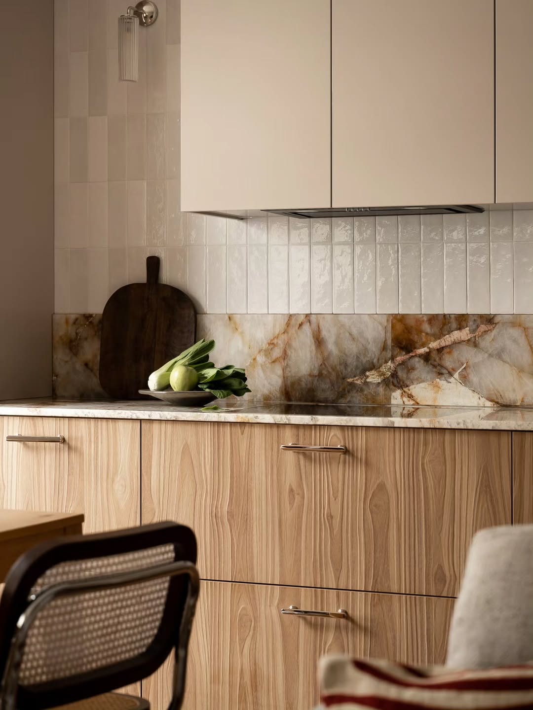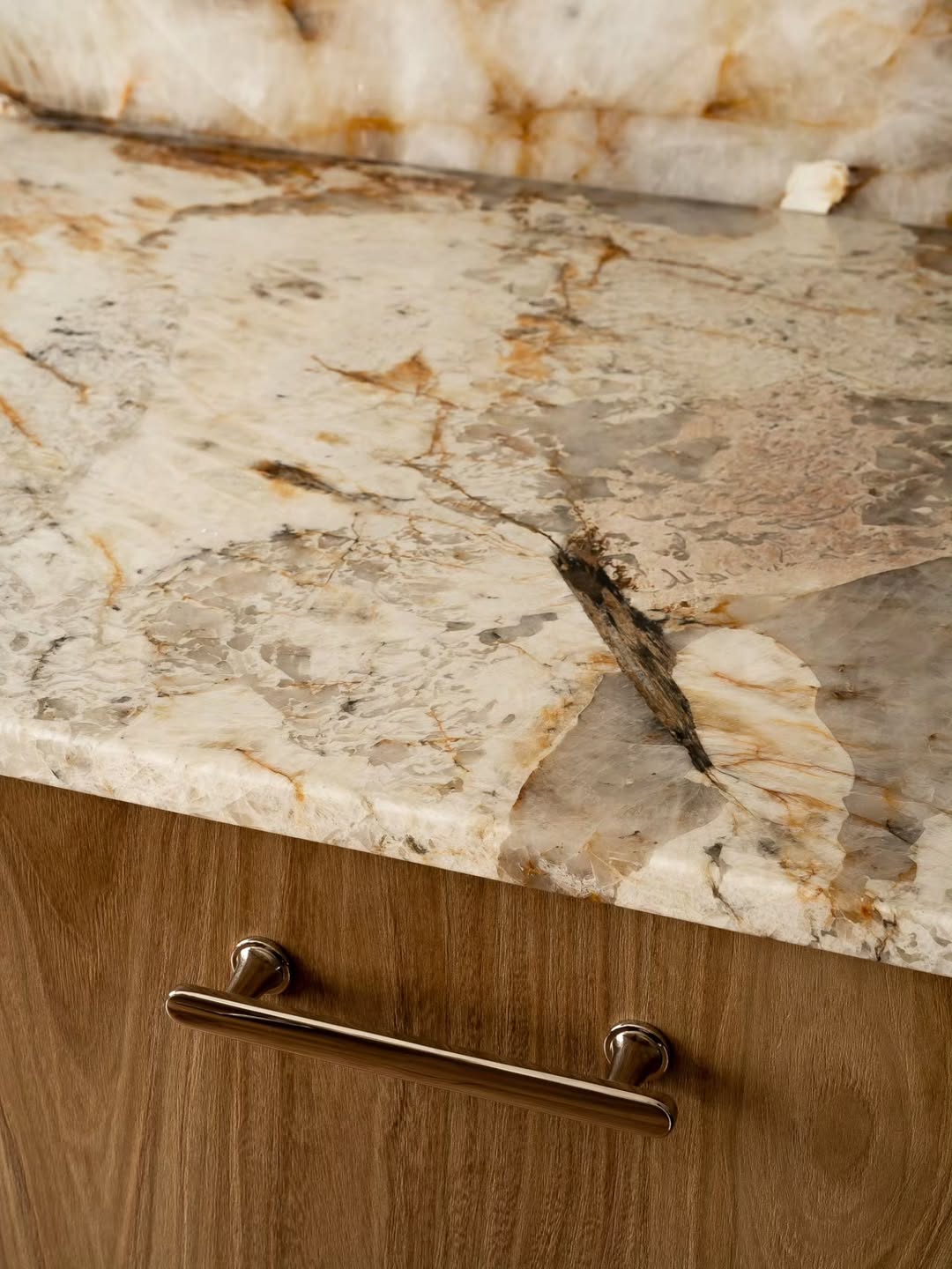 Η υφή και τα νερά του μαρμάρου φέρνουν έναν φυσικό ρυθμό στο χώρο, ενώ το φινίρισμα αναδεικνύει την ανθεκτικότητα και τη διαχρονικότητα του υλικού. Είναι ένα περιβάλλον ιδανικό για κάποιον που αγαπά τη μαγειρική, αλλά παράλληλα θέλει η κουζίνα του να λειτουργεί ως κομψό σκηνικό στην καθημερινότητα.