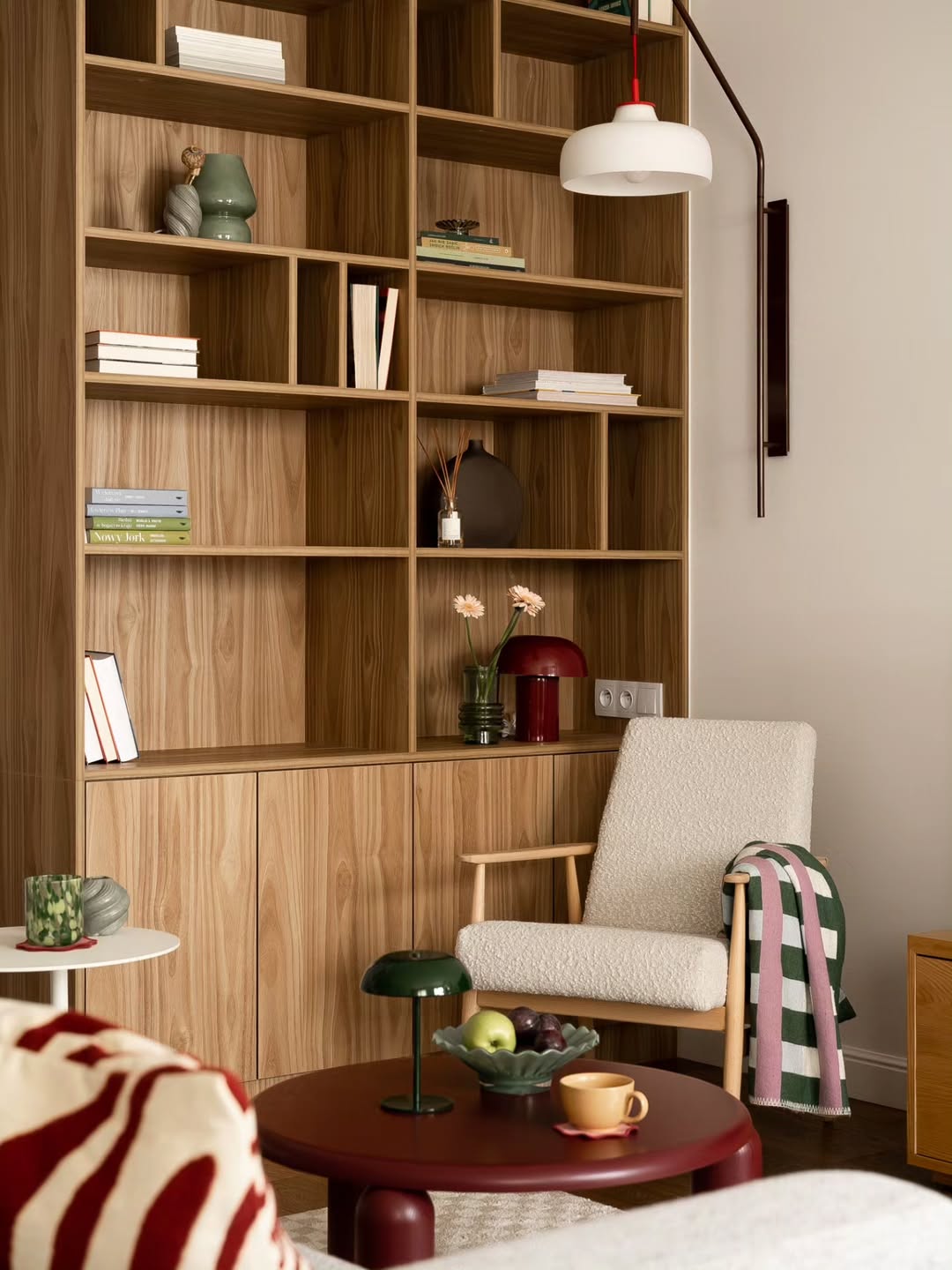 Το σαλόνι είναι το σημείο όπου η άνεση και η αισθητική συναντιούνται. Ένας καναπές γωνιακός μας προσκαλεί για χαλάρωση, ενώ το παχύ χαλί ενισχύει την αίσθηση ζεστασιάς. Η ξύλινη βιβλιοθήκη σε φυσικούς τόνους προσδίδει χαρακτήρα και πρακτικότητα, λειτουργώντας ταυτόχρονα ως αποθηκευτικός χώρος αλλά και ως στοιχείο που αγκαλιάζει το δωμάτιο. Η χρήση του ξύλου εδώ είναι καθοριστική: φέρνει θερμότητα και προσδίδει μια αίσθηση διαχρονικής οικειότητας, που ισορροπεί με τις καθαρές γραμμές του σύγχρονου design.