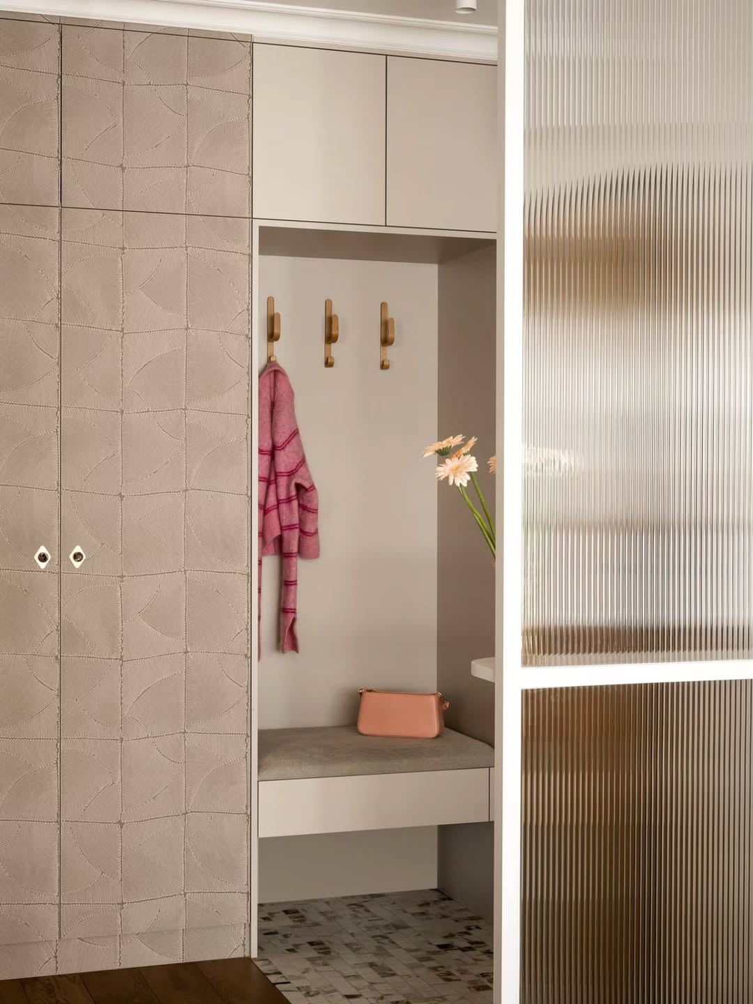 Η πρώτη εντύπωση δημιουργείται από τη διάφανη γυάλινη επιφάνεια που χωρίζει το χολ. Η επιλογή αυτή δεν απομονώνει τους χώρους, αλλά αντίθετα διατηρεί τη ροή του φωτός και προσδίδει ελαφρότητα. Η ημιδιαφάνεια επιτρέπει μια αίσθηση ιδιωτικότητας, χωρίς να διακόπτει την ενότητα του διαμερίσματος. Είναι ένα χαρακτηριστικό παράδειγμα για το πώς το design μπορεί να υπηρετεί την πρακτικότητα χωρίς να θυσιάζει την αίσθηση ανοιχτότητας.