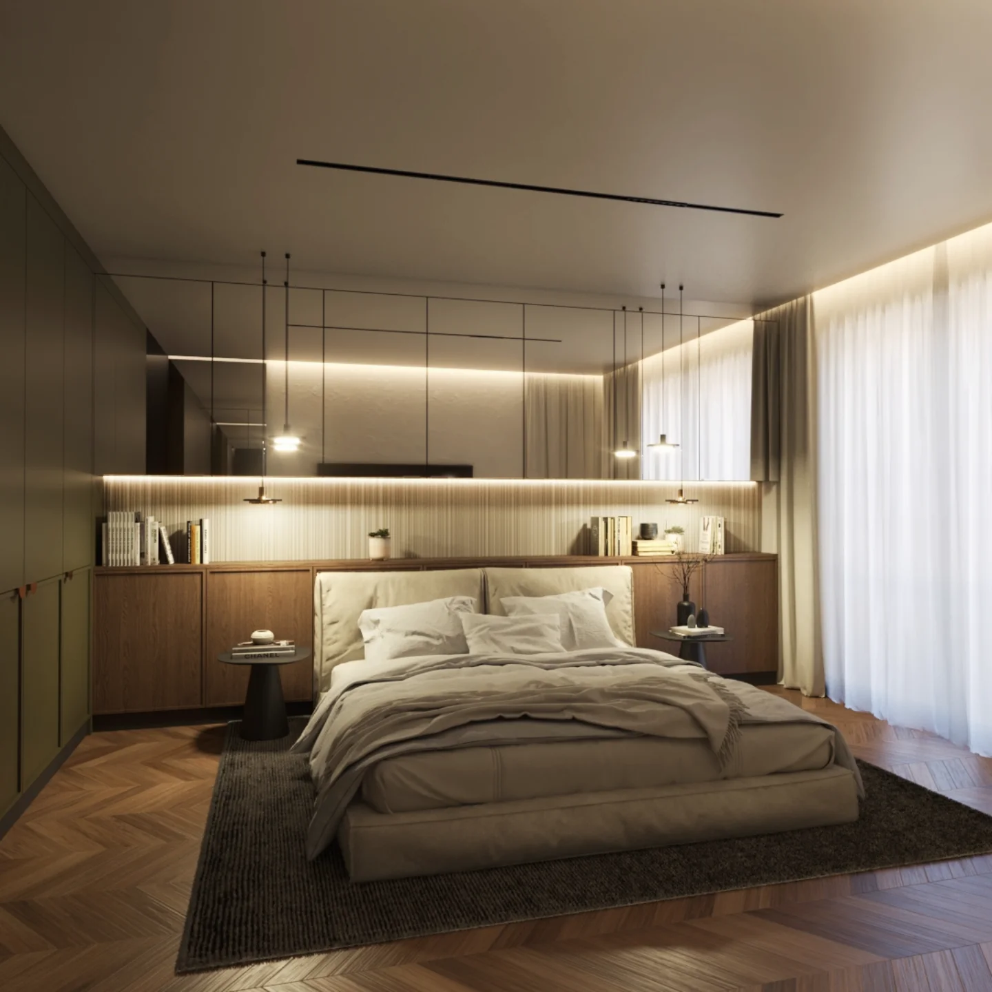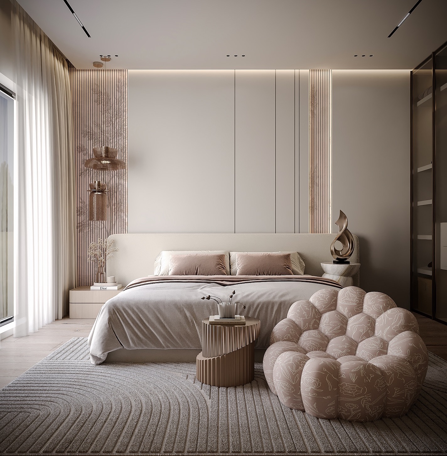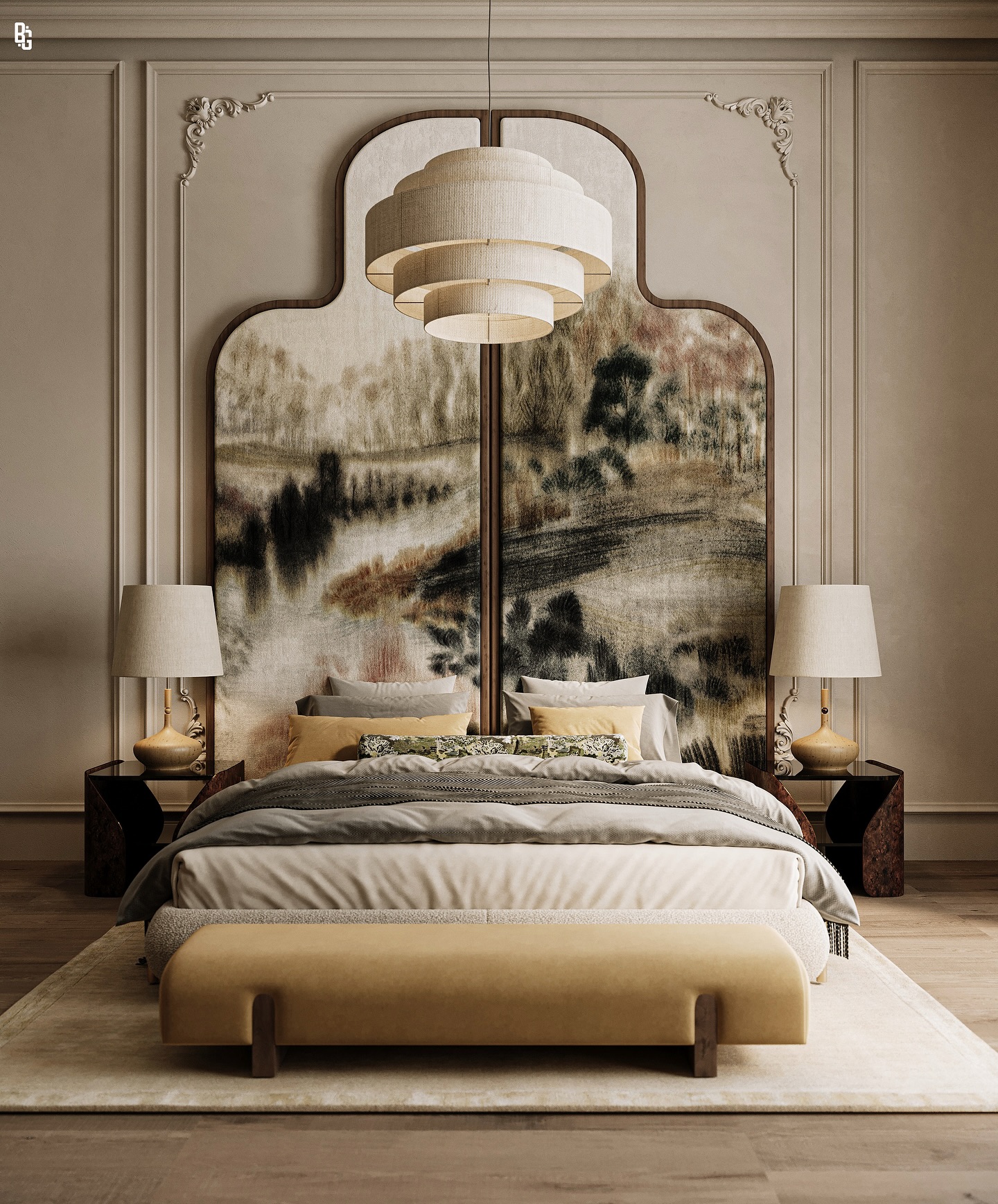 Αν έχετε ένα επιβλητικό κεφαλάρι ή φωτιστικά που πλαισιώνουν το κρεβάτι, ίσως δεν χρειάζεται τίποτε επιπλέον πάνω από αυτό. Το «κενό» λειτουργεί ως οπτική παύση και δίνει χώρο στα υπόλοιπα στοιχεία να «αναπνεύσουν».