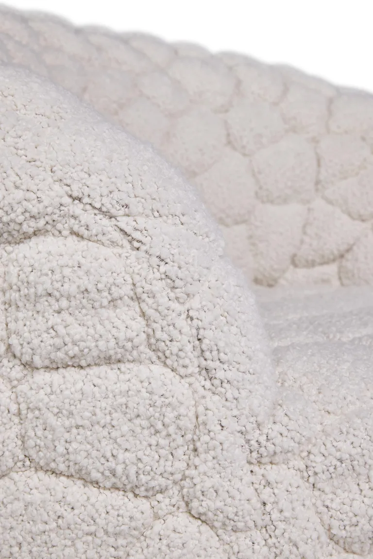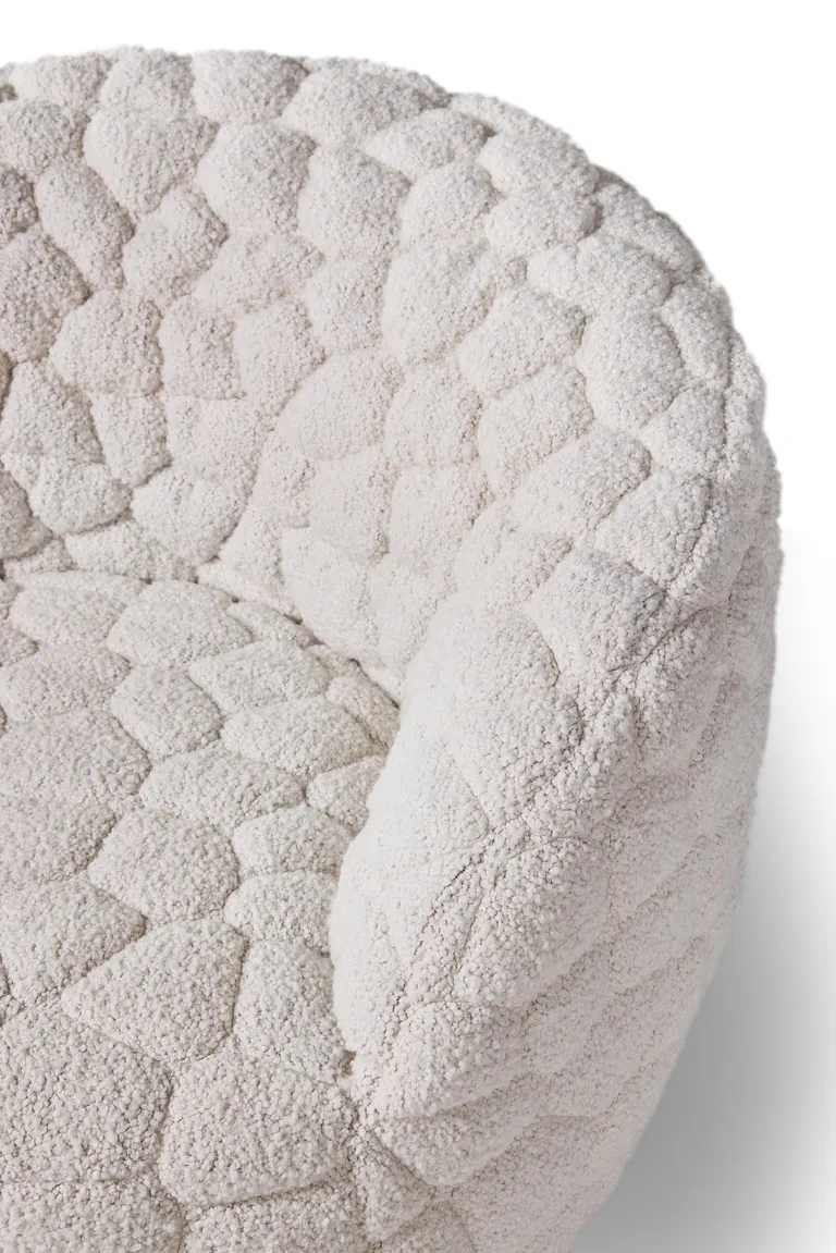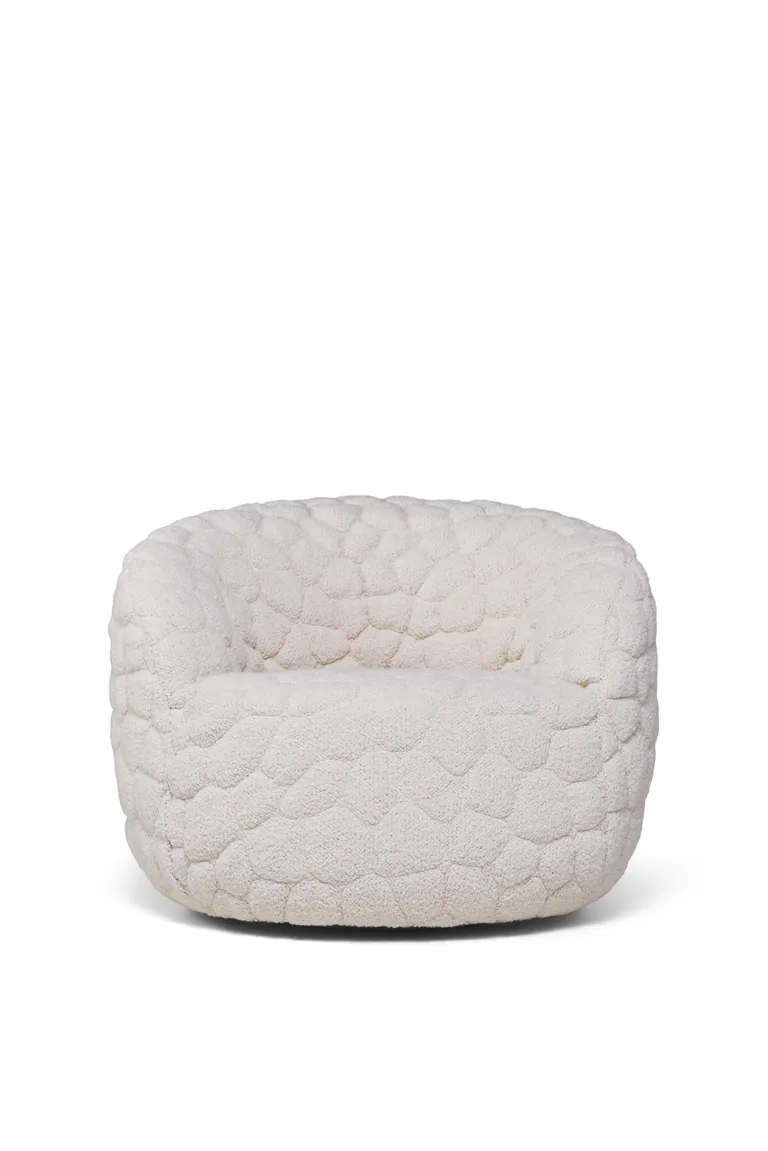 Με καμπυλωτή και συμπαγή μορφή, η πολυθρόνα διαθέτει επιφάνεια επενδεδυμένη με 3D τεχνική quilting, που θυμίζει, τολμούμε να πούμε, «κουνουπίδι». Για να ενισχυθεί η αίσθηση της θαλπωρής, έχει επενδυθεί με ύφασμα από παρθένο μαλλί, αλπακά και βαμβάκι και συνοδεύεται από μαξιλάρι που αγκαλιάζει το σώμα. Στερεωμένη σε κρυφή περιστρεφόμενη βάση, η πολυθρόνα αυτή είναι σχεδιασμένη για όσους αναζητούν ένα ήσυχο καταφύγιο από τον κόσμο.