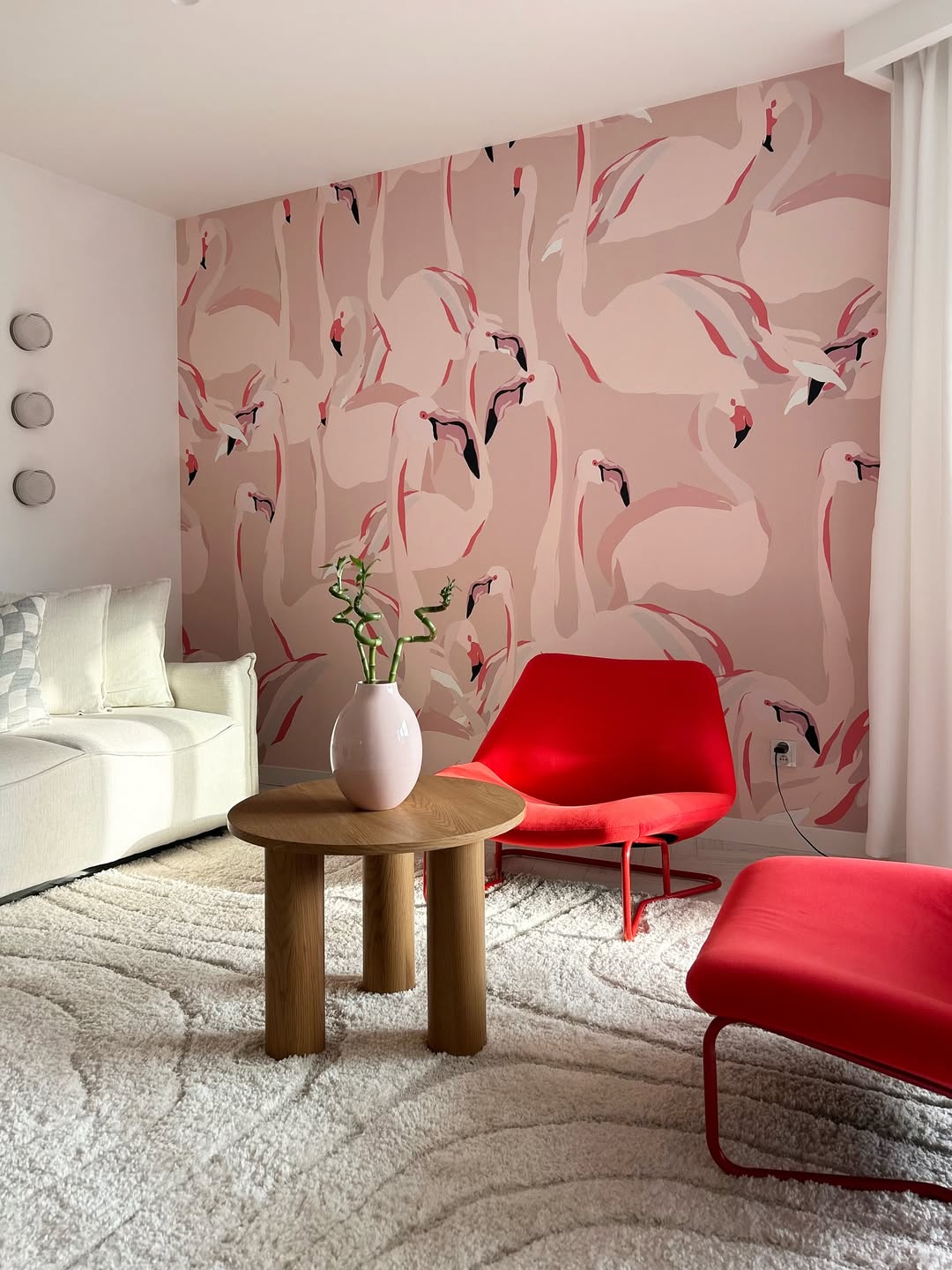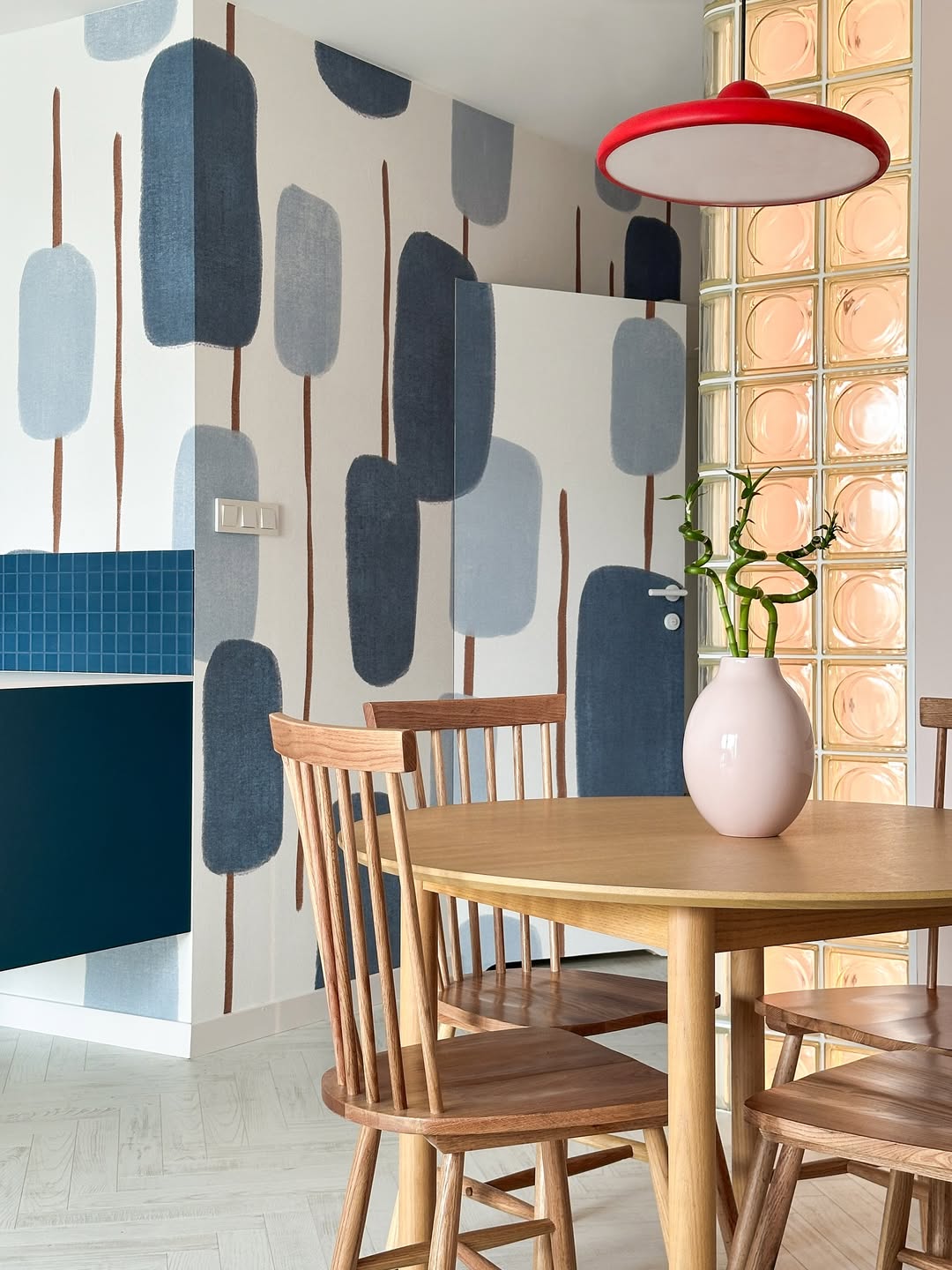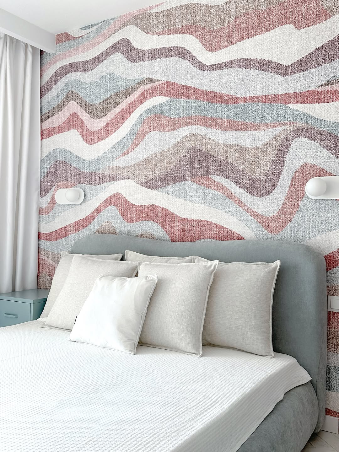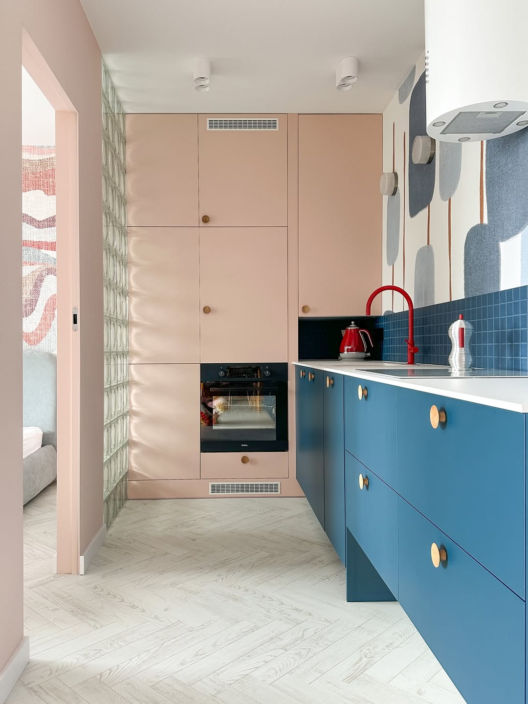 Το διαμέρισμα βασίζεται σε ένα απαλό, σχεδόν διαλογιστικό τρίο χρωμάτων, ροζ, μπλε και λευκό, που δημιουργεί μια χαρούμενη βάση. Αυτή η παλέτα επιτρέπει την εισαγωγή τολμηρών και εκφραστικών στοιχείων, όπως έντονα αξεσουάρ και πρωτότυπα διακοσμητικά αντικείμενα σε κόκκινο χρώμα, χωρίς να χάνεται η αρμονία. Κάθε δωμάτιο φωτίζεται φυσικά, δημιουργώντας αίσθηση χώρου και ελευθερίας, ενώ η προσεκτική επιλογή τόνων και υφών αναδεικνύει τις λεπτομέρειες που κάνουν το design να ξεχωρίζει.