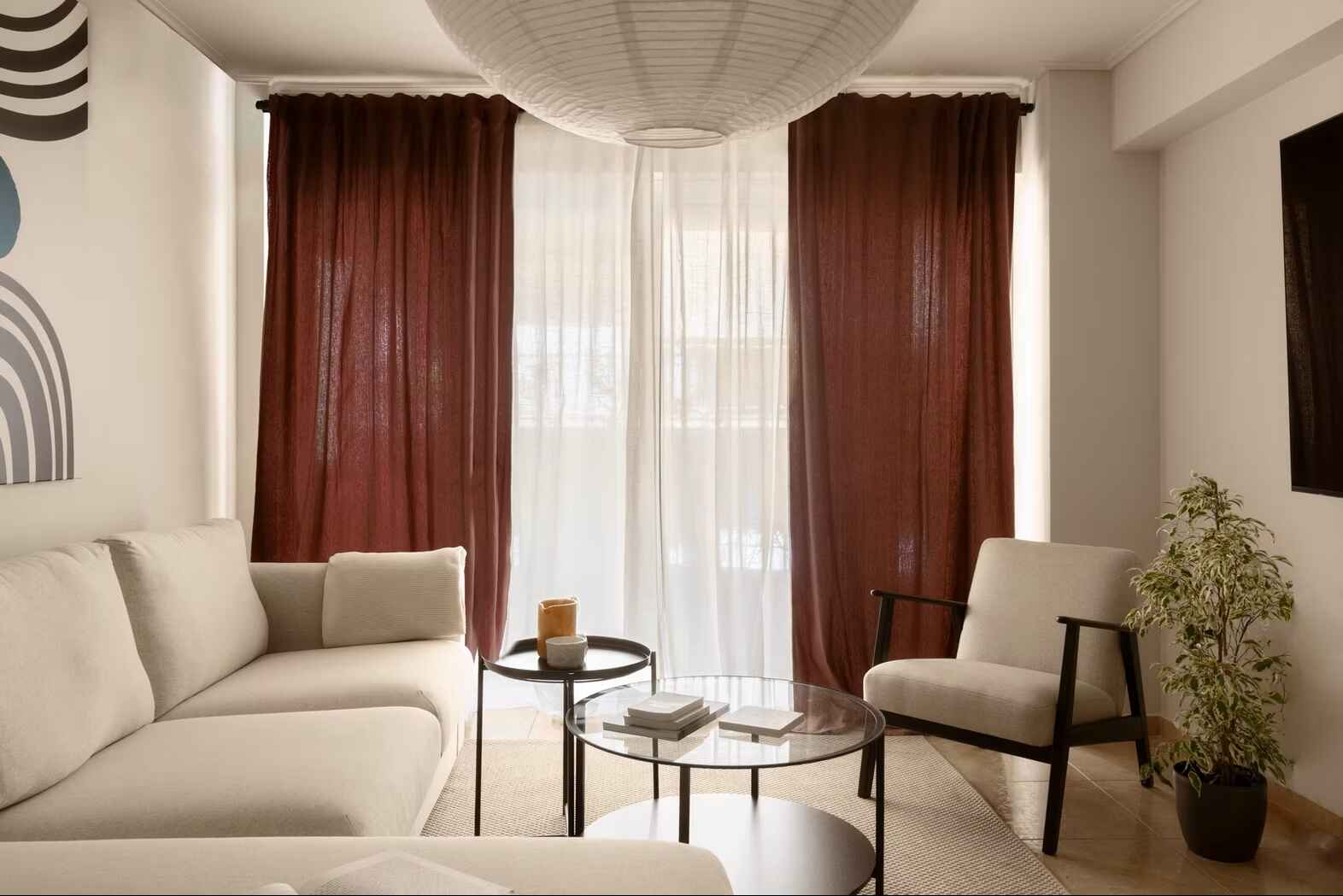 Η επιθυμία του ιδιοκτήτη ήταν σαφής: να δημιουργηθεί ένα ζεστό, φιλόξενο περιβάλλον με ισχυρή ταυτότητα. Η παλέτα που επιλέχθηκε κινείται ανάμεσα σε dusty pink και olive green, αποχρώσεις που δημιουργούν αρμονία και ηρεμία. Οι κουρτίνες έγιναν το στοιχείο-κλειδί του concept: σε κάθε υπνοδωμάτιο, ένα διαφορετικό σετ κουρτινών, blackout και διάφανων, λειτουργεί ως φίλτρο ανάμεσα στο εσωτερικό και την πόλη, χαρίζοντας στο καθένα ξεχωριστή προσωπικότητα.
