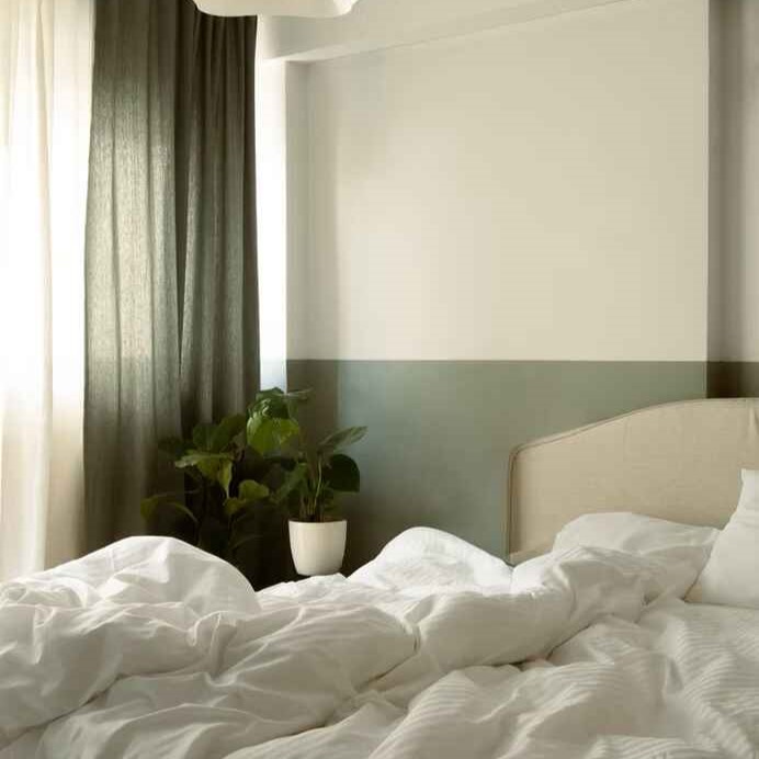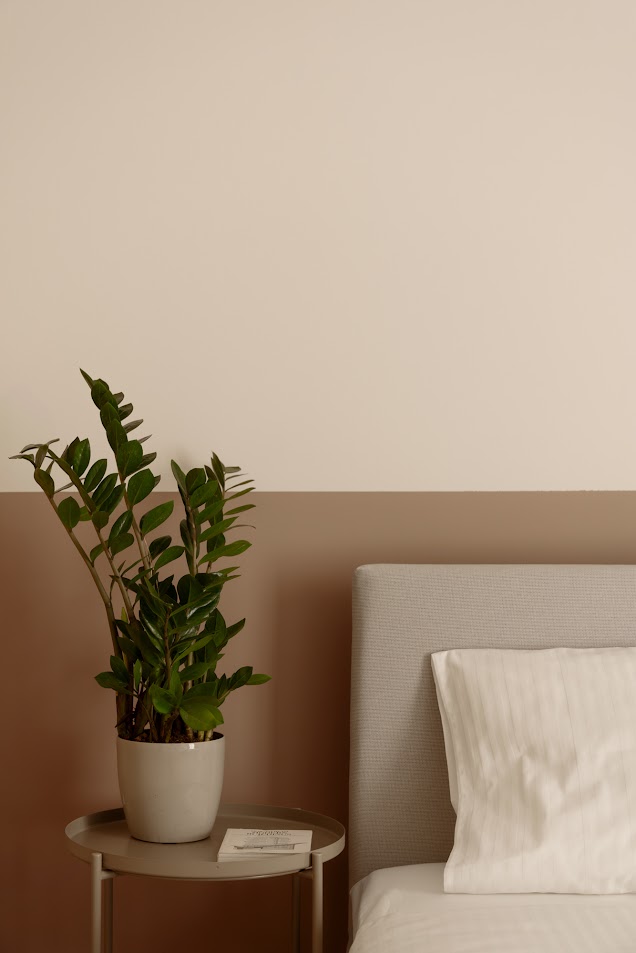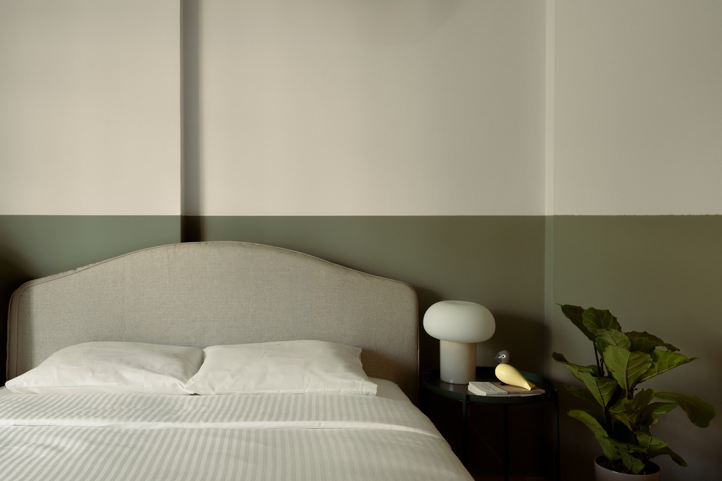 Στα υπνοδωμάτια, κάθε χώρος απέκτησε δική του χρωματική ταυτότητα. Ένα κεφαλάρι βαμμένο στον ίδιο τόνο με τις κουρτίνες λειτουργεί ως διακριτικό ενοποιητικό στοιχείο. Η φύση έχει τον δικό της ρόλο: φυτά εσωτερικού χώρου, στο σαλόνι και τα υπνοδωμάτια, ενισχύουν τη σύνδεση με το φυσικό στοιχείο και προσφέρουν αίσθηση φρεσκάδας.