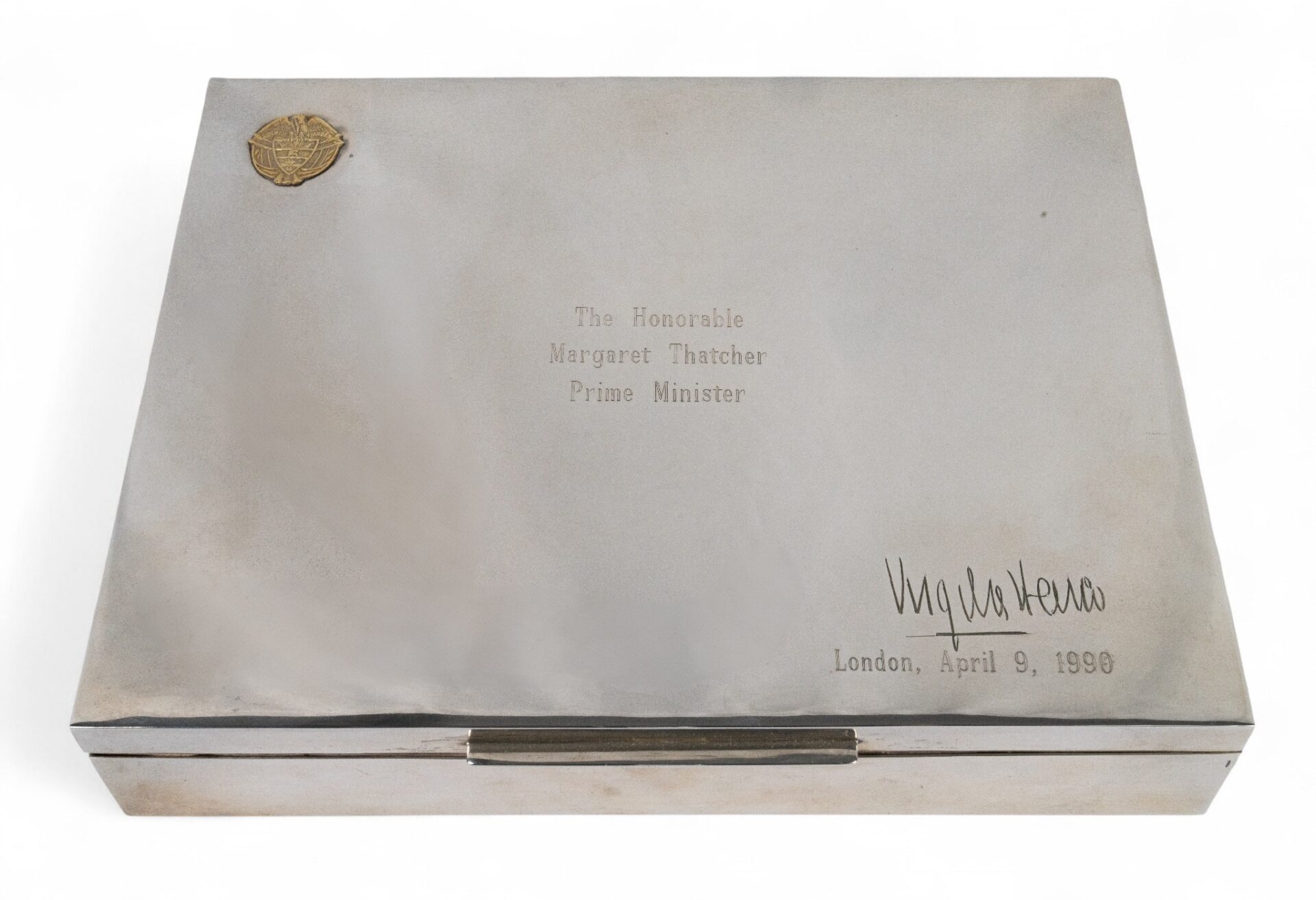 Ένα ασημένιο κουτί πούρων, δώρο από έναν πρώην πρόεδρο της Κολομβίας, τον Virgilio Barco Vargas, που αναμενόταν να πωληθεί για £500 (περίπου €570), έφτασε τα £18,000 (περίπου €20.500). Στο καπάκι είναι χαραγμένο: “The Honorable / Margaret Thatcher / Prime Minister.” Το κουτί είχε επίσης την υπογραφή του Vargas, χαραγμένη και χρονολογημένη: Λονδίνο, 9 Απριλίου, 1990. Μέσα στο κουτί υπάρχει μια κάρτα που γράφει: “El Presidente de la República de Colombia / Y la señora de Barco.” (Ο Πρόεδρος της Δημοκρατίας της Κολομβίας / Και η κυρία de Barco).