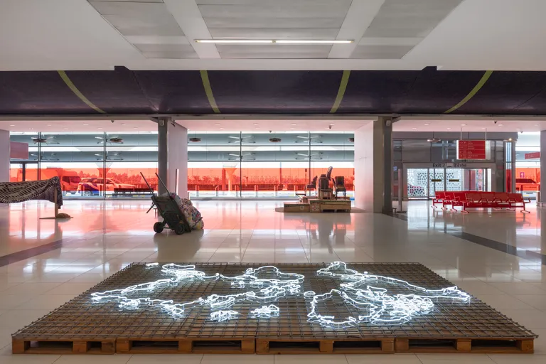 Η διαδρομή σας ξεκινά από την αίθουσα Departures, όπου χιλιάδες αποχαιρετισμοί έχουν εκτυλιχθεί τις τελευταίες δεκαετίες. Εκεί, σε συνεργασία με την Etihad Airways, συναντάτε έργα όπως το Thousand Layers of Stomach του AA. Murakami, μια υφαντική ερμηνεία γενετικού κώδικα από όστρακα, και τα μνημειακά «χαλιά–αεροπλάνα» του Ali Chaaban.