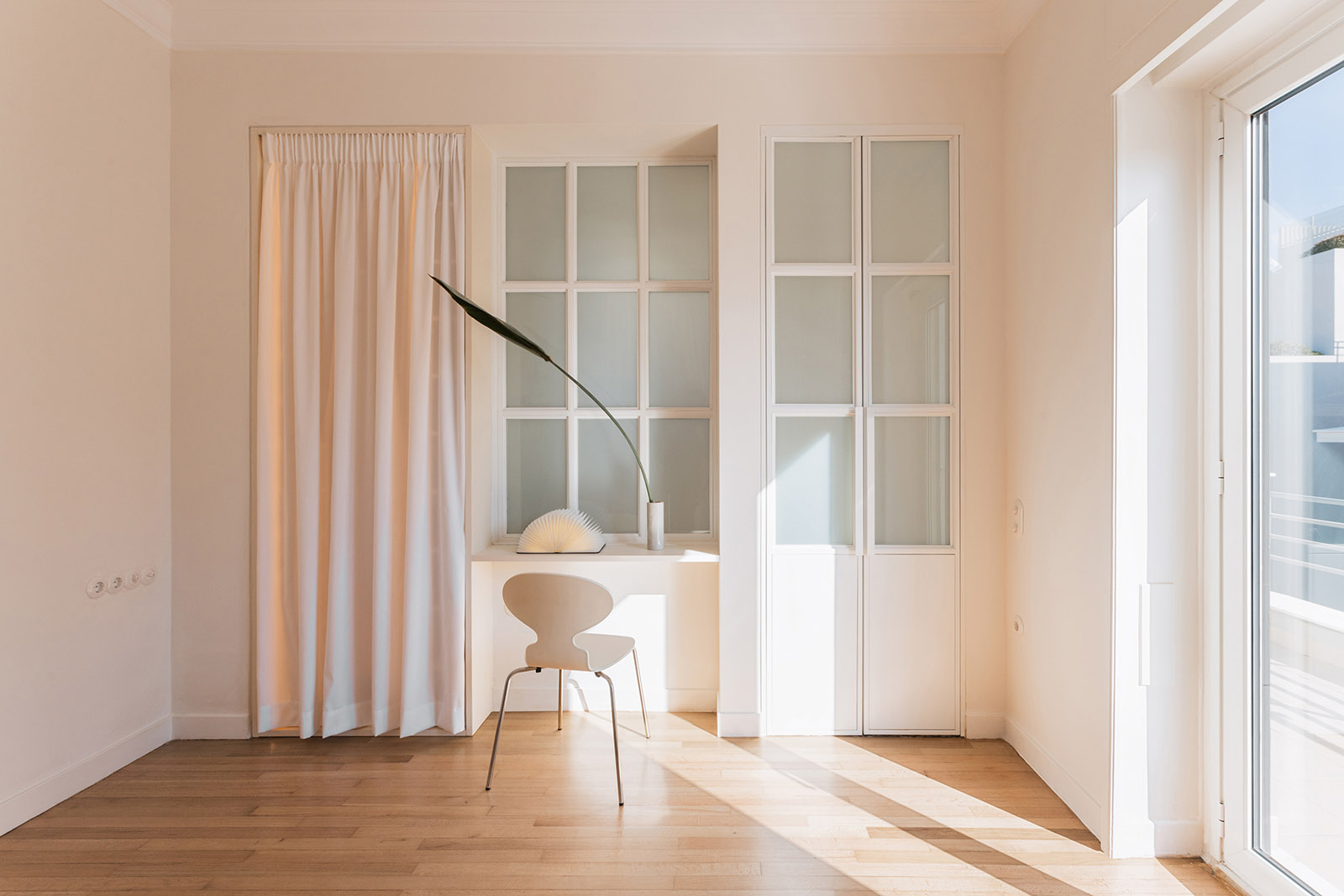 Μπαίνοντας στο διαμέρισμα του τελευταίου ορόφου, στη γωνία των Ανακτόρων στο Κολωνάκι, νιώθεις σαν να ανοίγει μπροστά σου μια ήσυχη σκηνή από μια άλλη Αθήνα. Οι χαμηλοί ήχοι της πόλης μένουν πίσω, καθώς το παλιό μεσοπολεμικό κέλυφος της δεκαετίας του ’30 σε τυλίγει με την πατίνα του χρόνου: το παλιό παρκέ που τρίζει διακριτικά, οι γύψινες κορνίζες που απλώνουν σκιές στα ταβάνια, οι δρύινες συρόμενες πόρτες που γλιστρούν σαν να γνωρίζουν καλά το τελετουργικό τους.