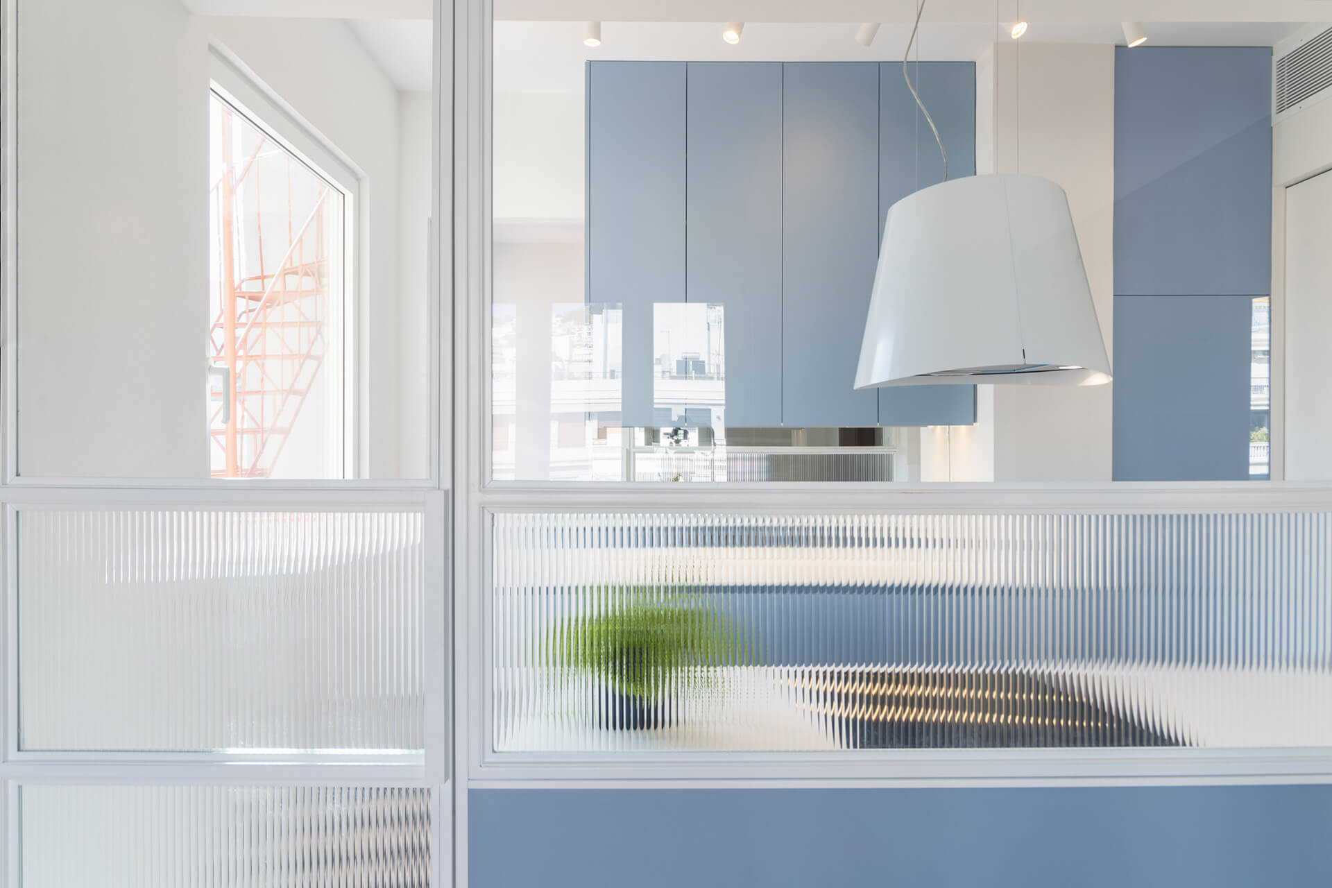 Και παρ’ όλο τον ιστορικό του χαρακτήρα, ο χώρος έχει κάτι εντελώς νέο. Το Constantine Bouras Studio δεν επέβαλε μια σύγχρονη αισθητική πάνω στην παλαιότητα, αντίθετα, της έδωσε χώρο να αναπνεύσει. Στους διαδρόμους συναντάς τσιμεντοπλακάκια και μωσαϊκά που θυμίζουν την αστική Αθήνα του ’50, όμως τα νέα υλικά της κουζίνας και των μπάνιων εναρμονίζονται οργανικά, σαν να ήταν πάντα εκεί. Το βλέμμα διασχίζει απρόσκοπτα το υάλινο χώρισμα που ενώνει τραπεζαρία και κουζίνα, φτάνοντας μέχρι τον Λυκαβηττό, μια θέα που μοιάζει να “επεκτείνει” το ίδιο το διαμέρισμα.