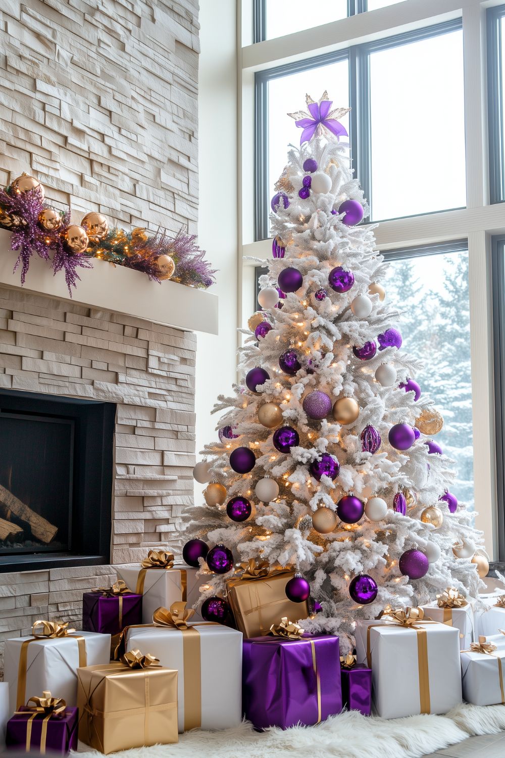 Η μοβ απόχρωση δίνει μια απαλή και ρομαντική νότα στους χώρους σας. Μπορείτε να τη χρησιμοποιήσετε αντί για το κλασικό κόκκινο, συνδυάζοντάς τη με φυσικούς τόνους πρασίνου ή χρυσές λεπτομέρειες. Προσθέστε μοβ κορδέλες, μικρές διακοσμητικές μπάλες ή υφασμάτινες πινελιές για να δημιουργήσετε μια αίσθηση ζεστασιάς χωρίς να υπερφορτώνετε τον χώρο.