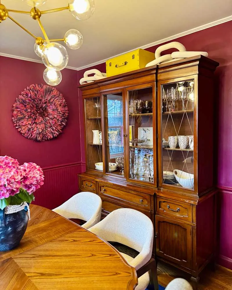 Παρά την παλαιότητα του χώρου, η Μαλάικα εντόπισε κάποια κομμάτια που αξίζει να διατηρηθούν, όπως τη βιτρίνα, το τραπέζι και τις βελούδινες καρέκλες. Αντί να τα απομακρύνει, τα ενέταξε σε μια πιο σύγχρονη διακοσμητική προσέγγιση. Το παλιό χαλί αντικαταστάθηκε με ένα μοντέρνο σχέδιο, ενώ προστέθηκαν καρέκλες mid-century modern για ανανέωση. Το παλιό ορειχάλκινο φωτιστικό αντικαταστάθηκε από ένα σύγχρονο sputnik φωτιστικό, που η οικογένεια είχε ήδη στο προηγούμενο σπίτι της.