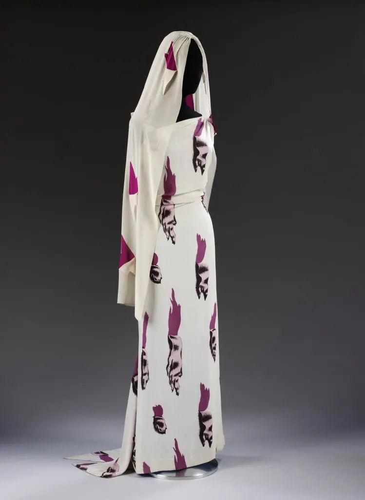 Βραδινό φόρεμα Tears με πέπλο κεφαλής, σχεδιασμένο από την Elsa Schiaparelli, για τη συλλογή Circus, καλοκαίρι 1938. Το ύφασμα σχεδιάστηκε από τον Salvador Dalí (photo credit: Victoria and Albert Museum)