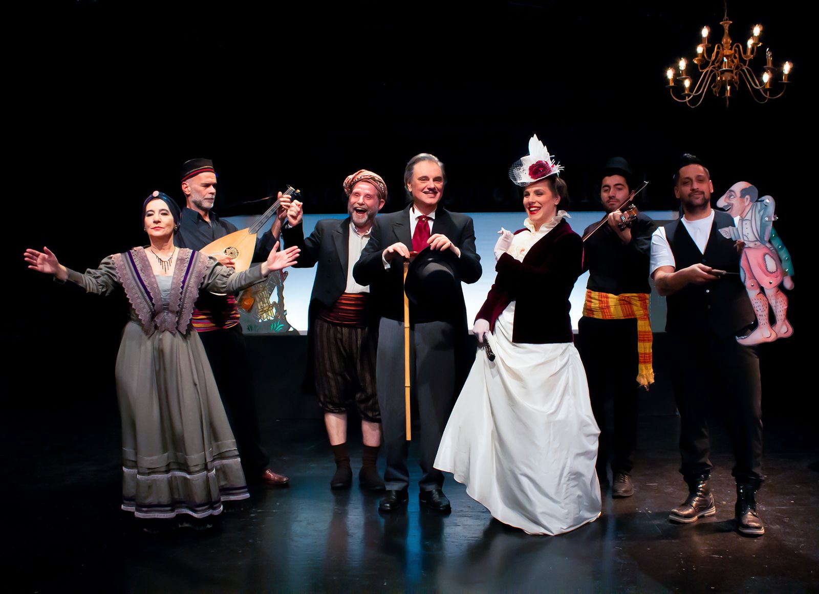 Στην παράσταση συμμετέχει ζωντανά ο καραγκιοζοπαίχτης Κώστας Σπυρόπουλος. Βοηθοί στο μπερντέ, οι μαθητές της Ακαδημίας Θεάτρου Σκιών «Θανάσης Σπυρόπουλος».