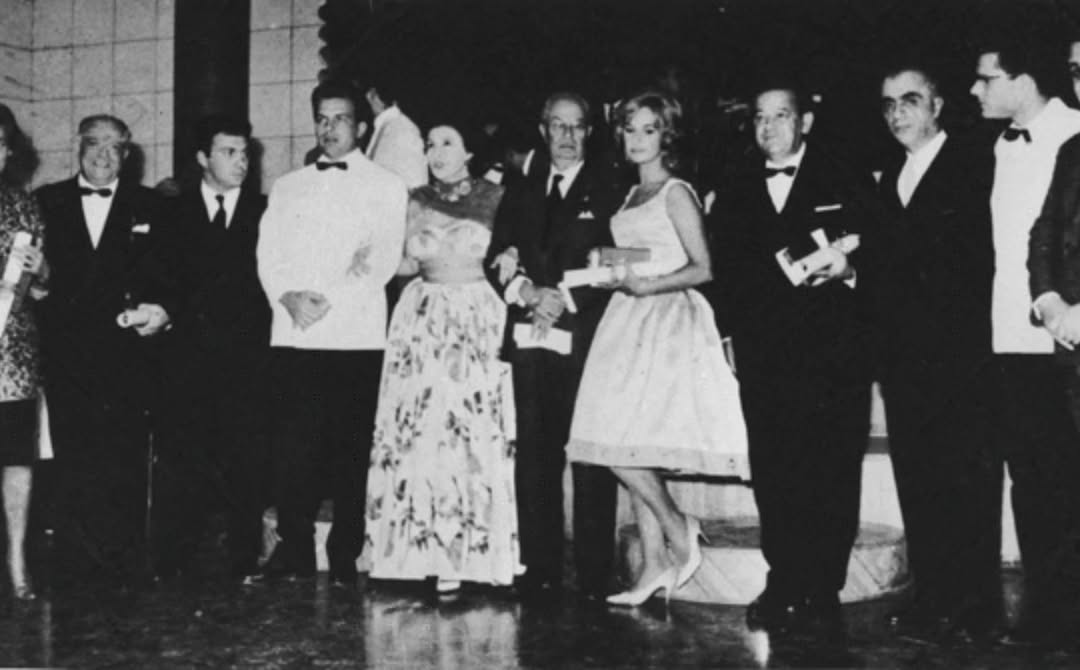 Τελετή λήξης της 1ης διοργάνωσης: Βραβευμένοι και μέλη της Κριτικής Επιτροπής. Διακρίνονται οι Στρατής Μυριβήλης, Μάνος Χατζιδάκις, Κατίνα Παξινού, Τάκης Κανελλόπουλος, Δημήτρης Χορν, Αλίκη Βουγιουκλάκη, Παντελής Ζερβός. Photo credit: @filmfestivalgr/IG