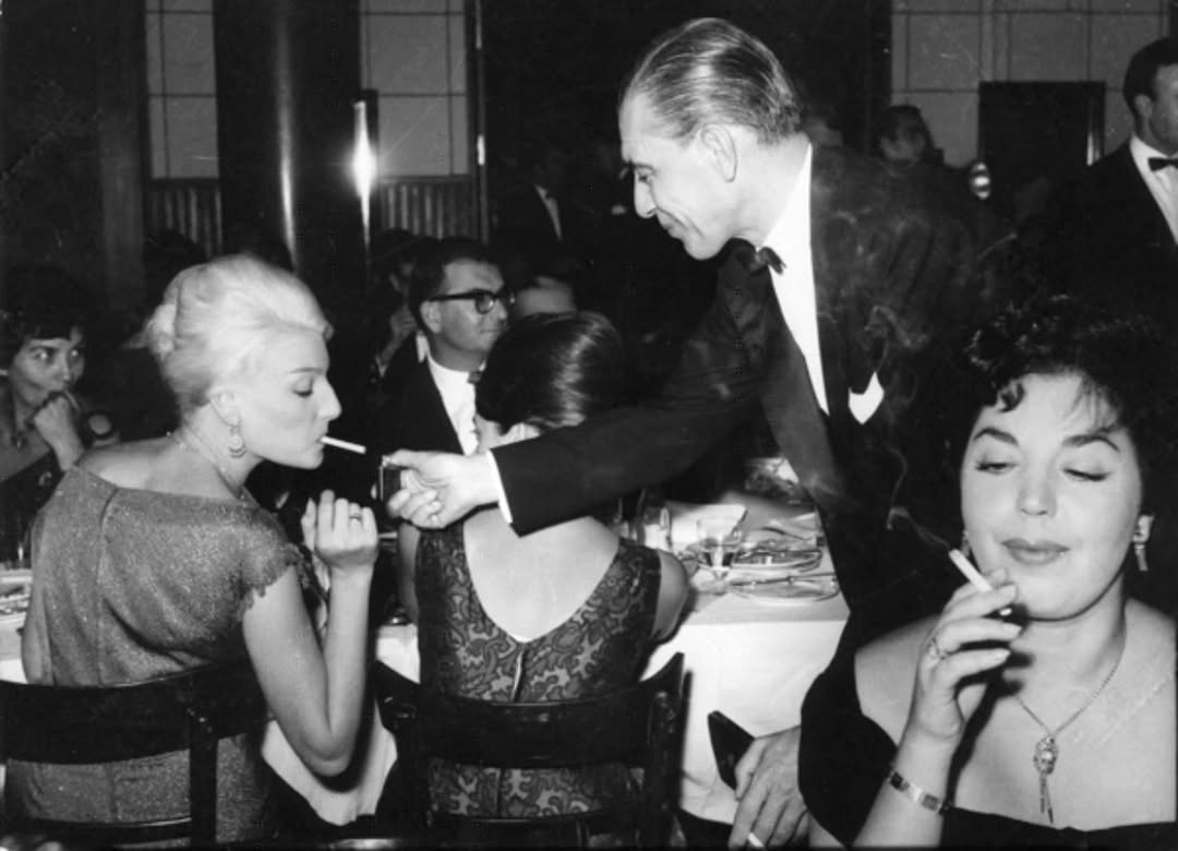 Ο Πρόεδρος της ΔΕΘ Γιώργος Γεωργιάδης ανάβει το τσιγάρο της Μάρως Κοντού. Σε πρώτο πλάνο η Καίτη Λαμπροπούλου. Photo credit: @filmfestivalgr/IG