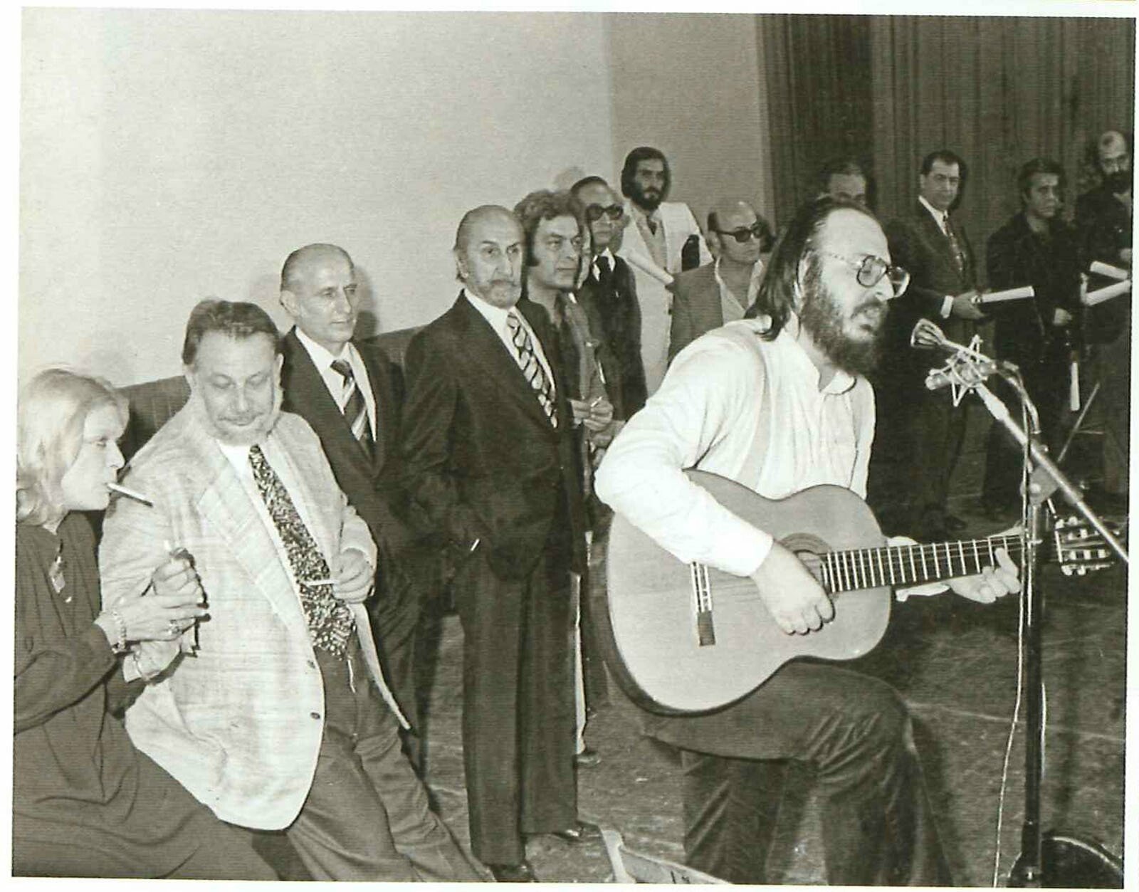 Ο Διονύσης Σαββόπουλος στην τελετή λήξης του 17ου Φεστιβάλ Ελληνικού Κινηματογράφου. Διακρίνονται από αριστερά μεταξύ άλλων οι Μελίνα Μερκούρη, Απόστολος Μαγγανάρης, Μάνος Λοϊζος, Γιώργος Παπαλιός, Θόδωρος Αγγελόπουλος, Γιώργος Τζαβέλλας, Λάμπρος Λιαρόπουλος και Παντελής Βούλγαρης (1976), Photo credit: Ψηφιακό Αρχείο του Φεστιβάλ Κινηματογράφου Θεσσαλονίκης