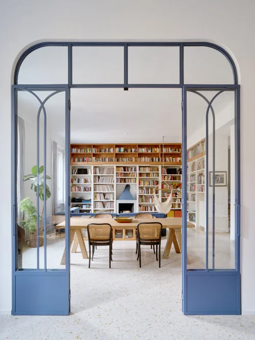 Η ανάγκη δημιουργίας ενός επιπλέον χώρου, ενός γραφείου για smart working, οδήγησε στη μείωση του παλιού σαλονιού. Η νέα διαχωριστική τοιχοποιία ενσωματώνει μια εντυπωσιακή τετράφυλλη σιδερένια-γυάλινη πόρτα σε βαθύ μπλε (250×300 εκ.), που επιτρέπει στο φως να διαχέεται ανεμπόδιστα, διατηρώντας την αίσθηση ευρυχωρίας και τη φωτεινότητα του διαμερίσματος.